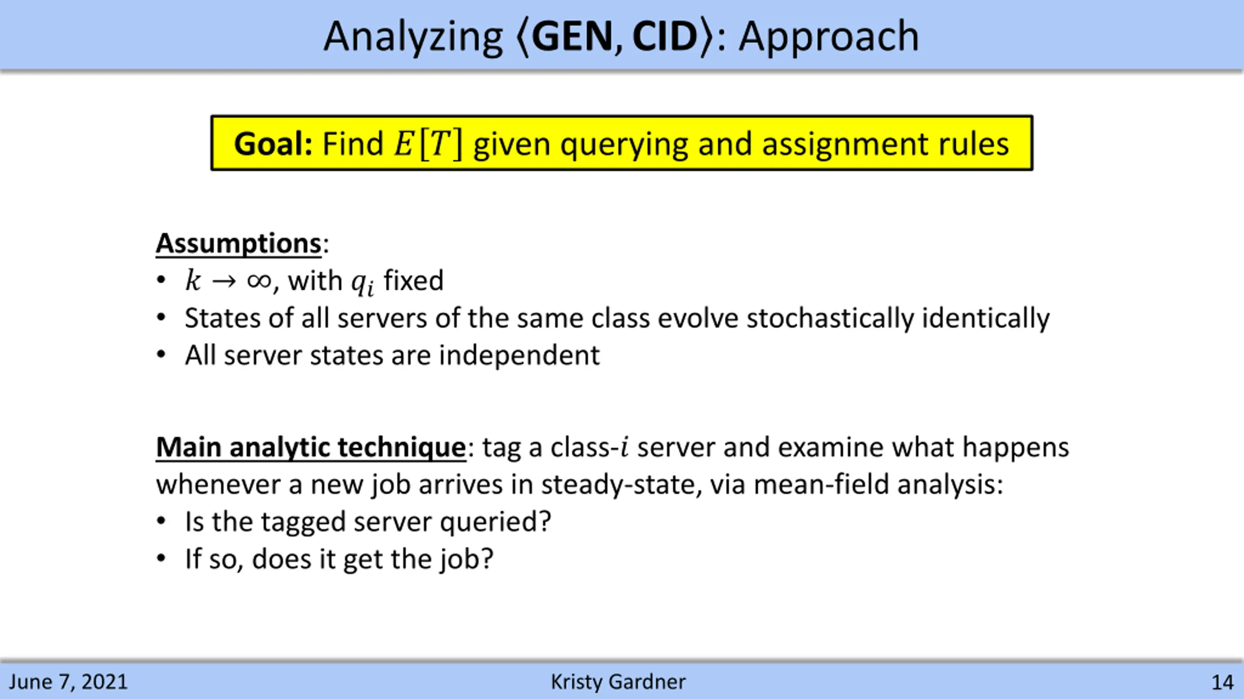 Analyzing GEN,CID : Approach Goal: Find ? ? given querying and assignment rules Assumptions: ? , with ?? fixed States of all servers of the same class evolve stochastically identically All server states are independent Main analytic technique: tag a class-? server and examine what happens whenever a new job arrives in steady-state, via mean-field analysis: Is the tagged server queried? If so, does it get the job? June 7, 2021 Kristy Gardner 14