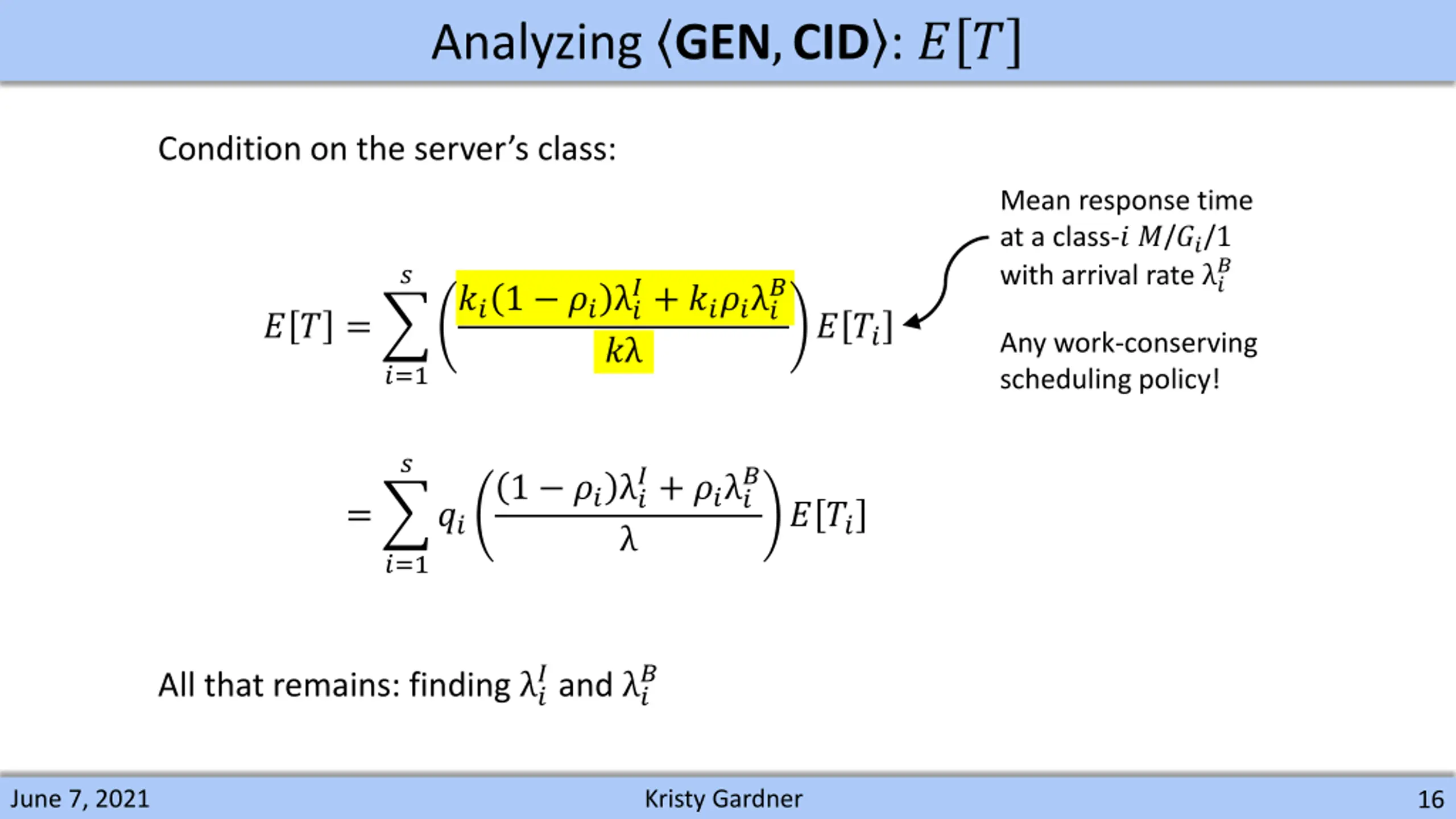 Analyzing GEN,CID : ? ? Condition on the server s class: Mean response time at a class-??/??/1 with arrival rate ? ? ? ?+ ???? ? ? ? ??1 ?? ? ? ? = ? ?? Any work-conserving scheduling policy! ?=1 ? ?+ ?? ? ? 1 ?? ? = ?? ? ?? ?=1 ? and ? ? All that remains: finding ? June 7, 2021 Kristy Gardner 16