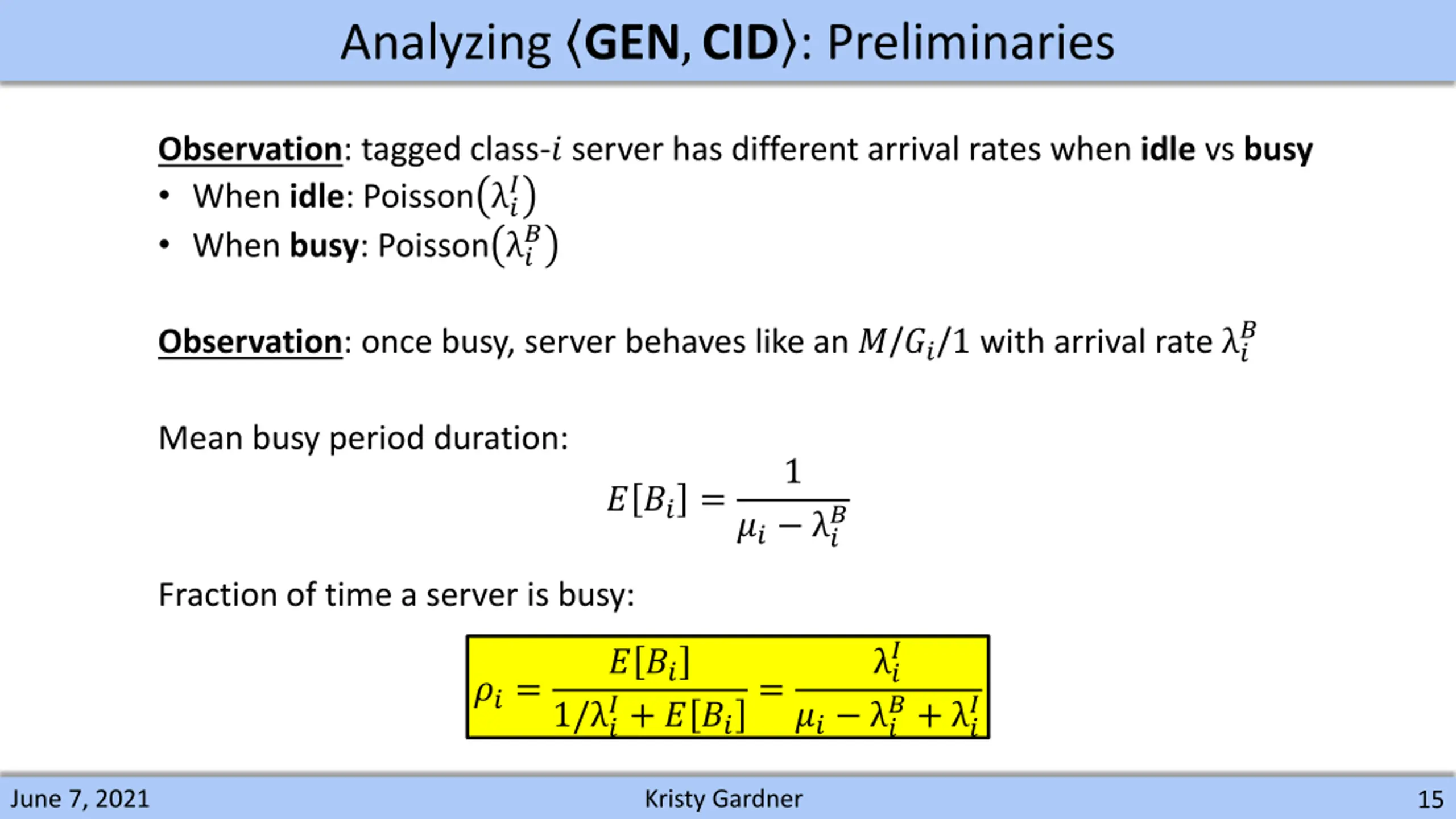 Analyzing GEN,CID : Preliminaries Observation: tagged class-? server has different arrival rates when idle vs busy When idle: Poisson ? When busy: Poisson ? ? ? ? Observation: once busy, server behaves like an ?/??/1 with arrival rate ? Mean busy period duration: 1 ? ?? = ? ?? ? Fraction of time a server is busy: ? ? ?? ?+ ? ?? ? ??= = ?+ ? ? 1/ ? ?? ? June 7, 2021 Kristy Gardner 15