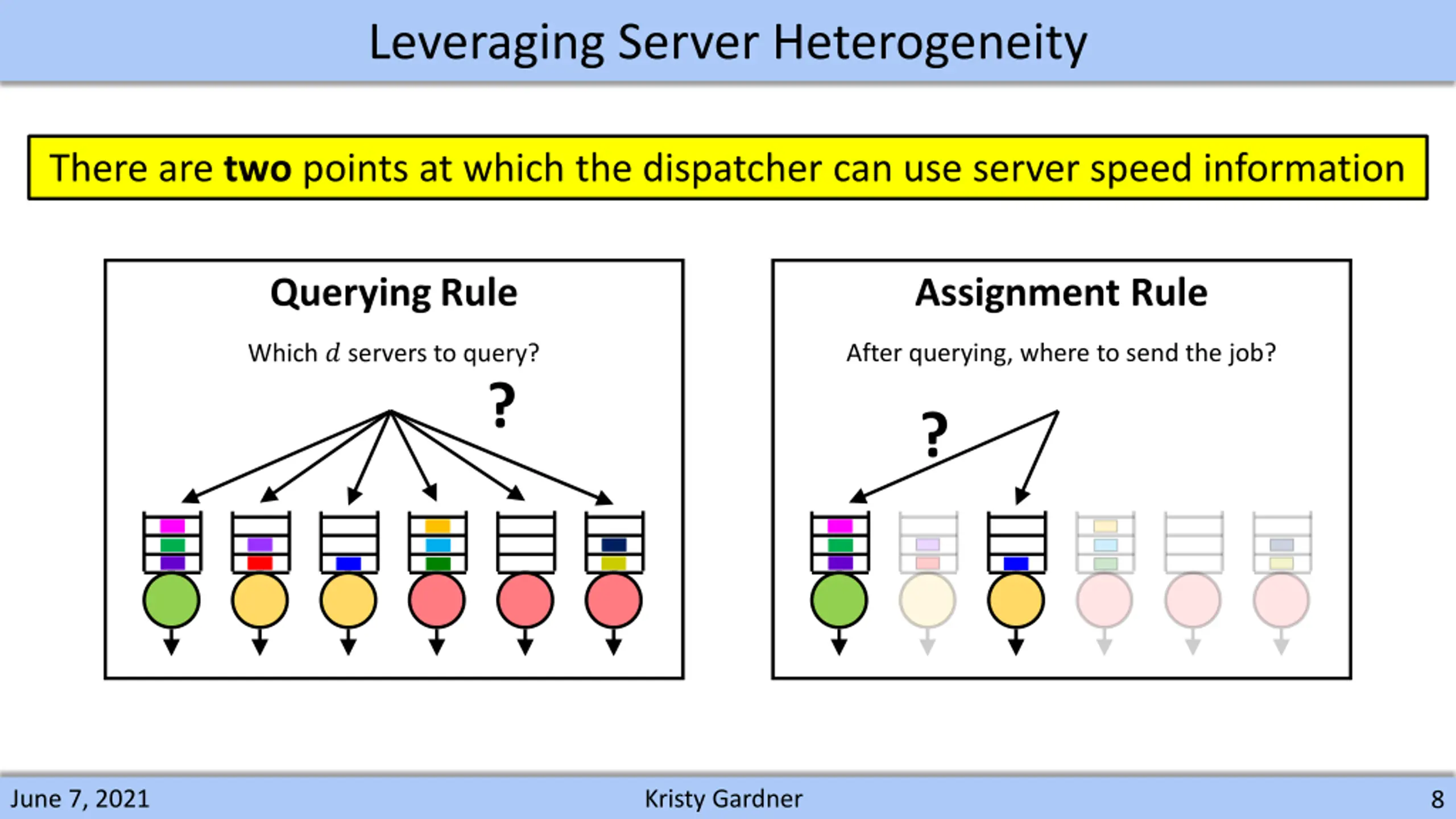 Leveraging Server Heterogeneity There are two points at which the dispatcher can use server speed information QueryingRule Assignment Rule Which ? servers to query? After querying, where to send the job? ? ? June 7, 2021 Kristy Gardner 8