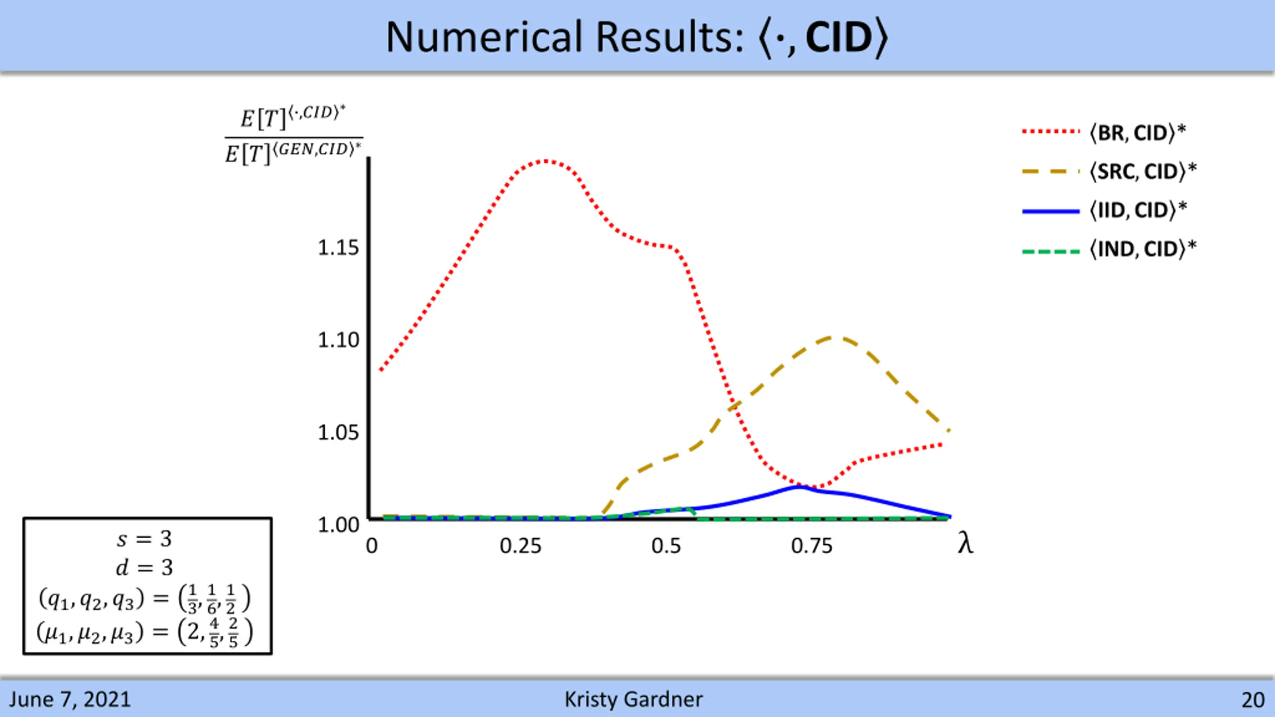 Numerical Results: ,CID ,??? ? ? ? ? BR,CID * ???,??? SRC,CID * IID,CID * 1.15 IND,CID * 1.10 1.05 1.00 ? = 3 ? = 3 0 0.25 0.5 0.75 1 3,1 6,1 5,2 ?1,?2,?3 = ?1,?2,?3 = 2,4 2 5 June 7, 2021 Kristy Gardner 20