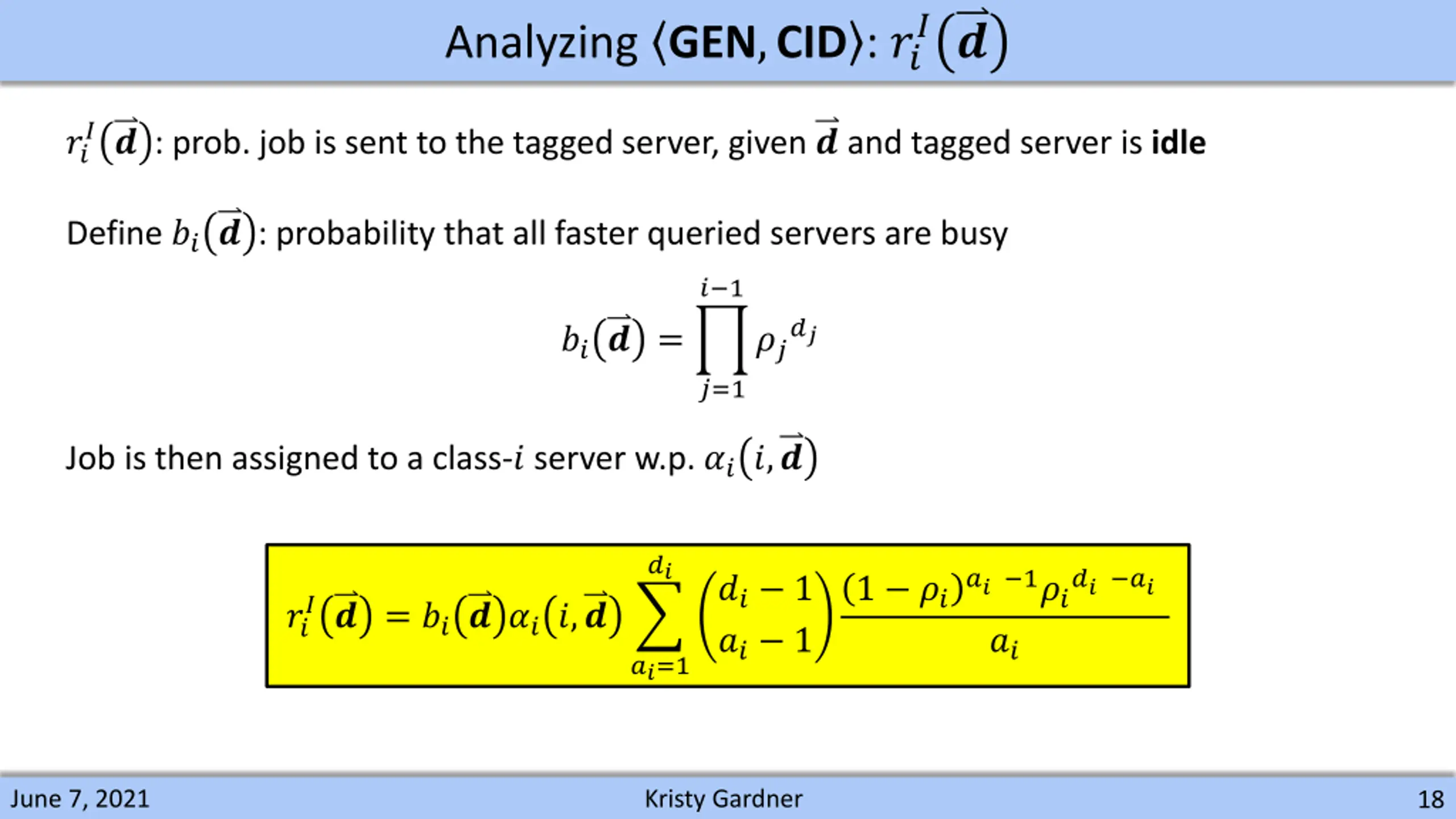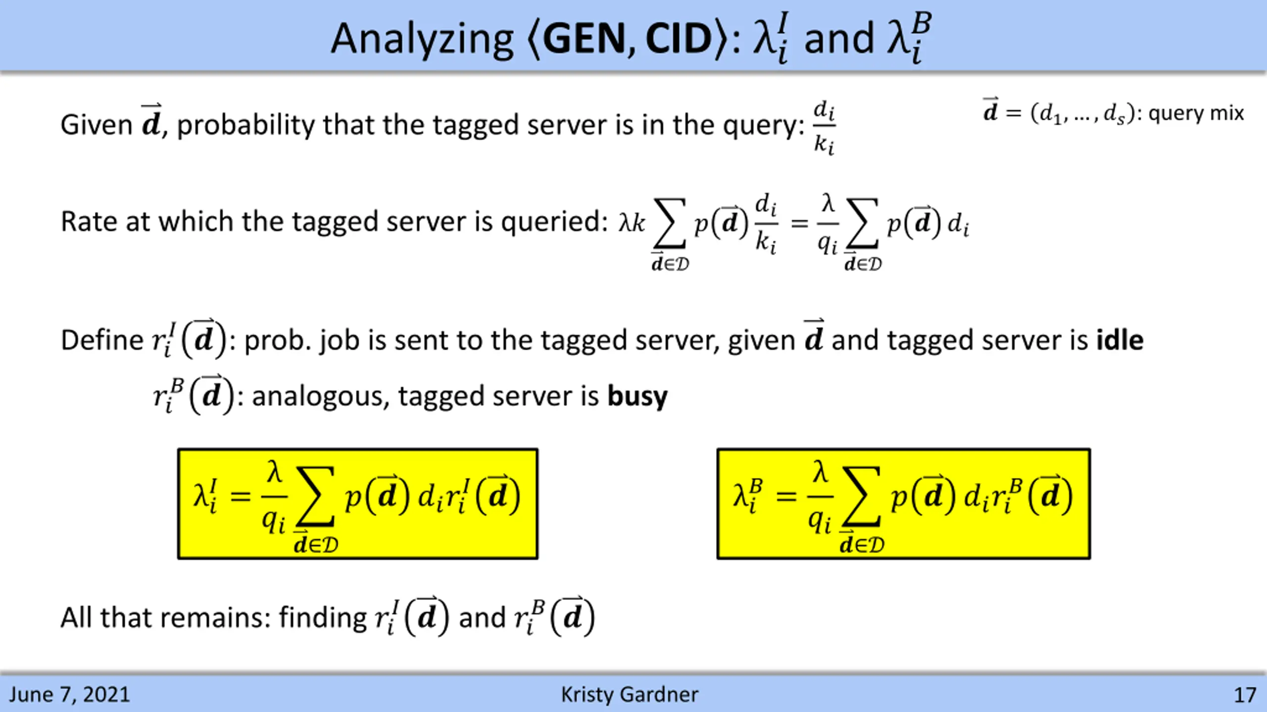 ? and ? ? Analyzing GEN,CID : ? Given ?, probability that the tagged server is in the query: ?? ? = ?1, ,??: query mix ?? ?? ?? = Rate at which the tagged server is queried: ? ? ? ? ? ?? ?? ? ? ? ? ?? : prob. job is sent to the tagged server, given ? and tagged server is idle Define ?? ?? : analogous, tagged server is busy ?? ?= ?= ?? ?? ? ? ? ???? ? ? ? ???? ?? ?? ? ? ? ? ?? and ?? ?? All that remains: finding ?? June 7, 2021 Kristy Gardner 17