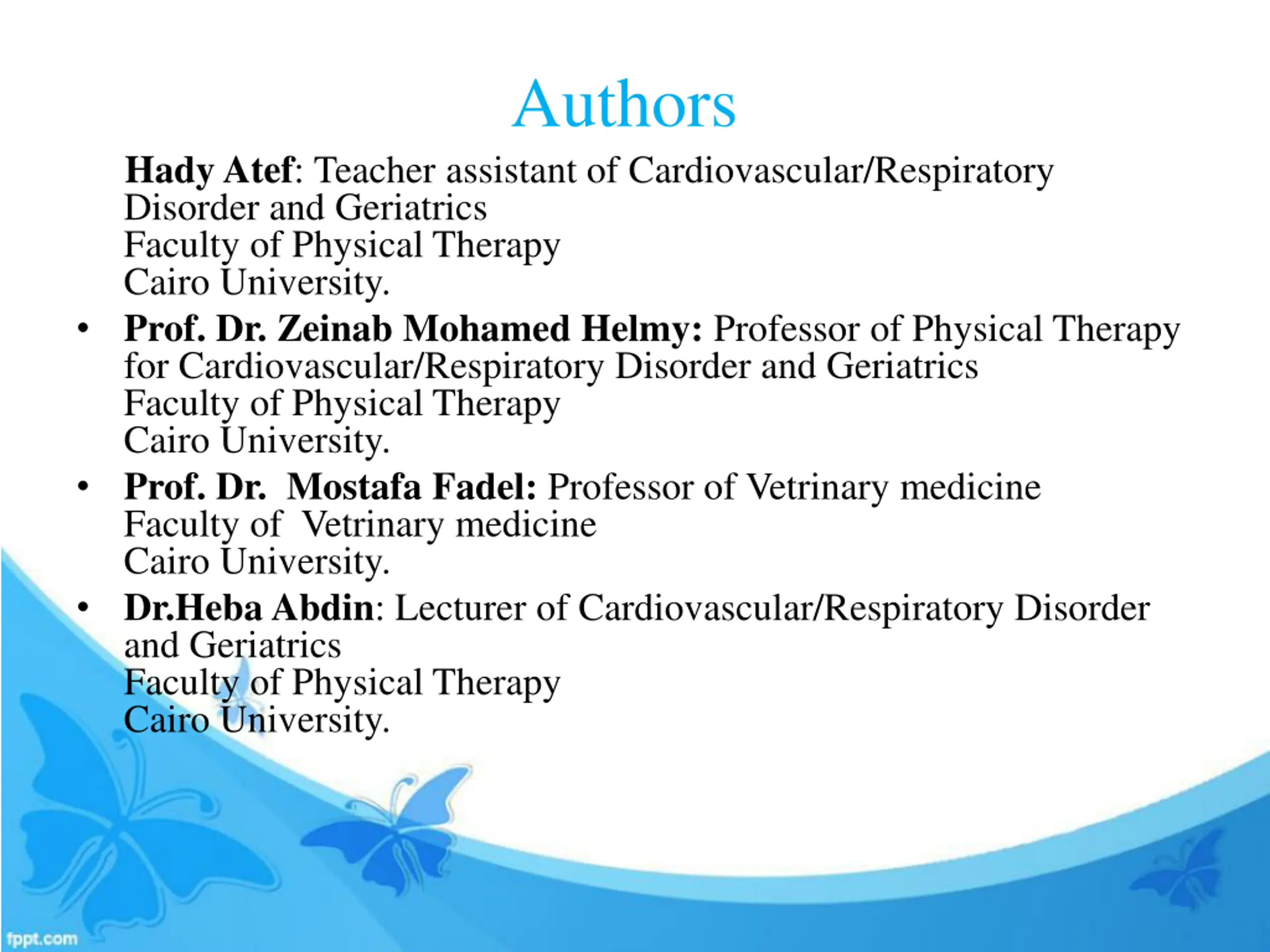 Authors Hady Atef: Teacher assistant of Cardiovascular/Respiratory Disorder and Geriatrics Faculty of Physical Therapy Cairo University. Prof. Dr. Zeinab Mohamed Helmy: Professor of Physical Therapy for Cardiovascular/Respiratory Disorder and Geriatrics Faculty of Physical Therapy Cairo University. Prof. Dr. Mostafa Fadel: Professor of Vetrinary medicine Faculty of Vetrinary medicine Cairo University. Dr.Heba Abdin: Lecturer of Cardiovascular/Respiratory Disorder and Geriatrics Faculty of Physical Therapy Cairo University.