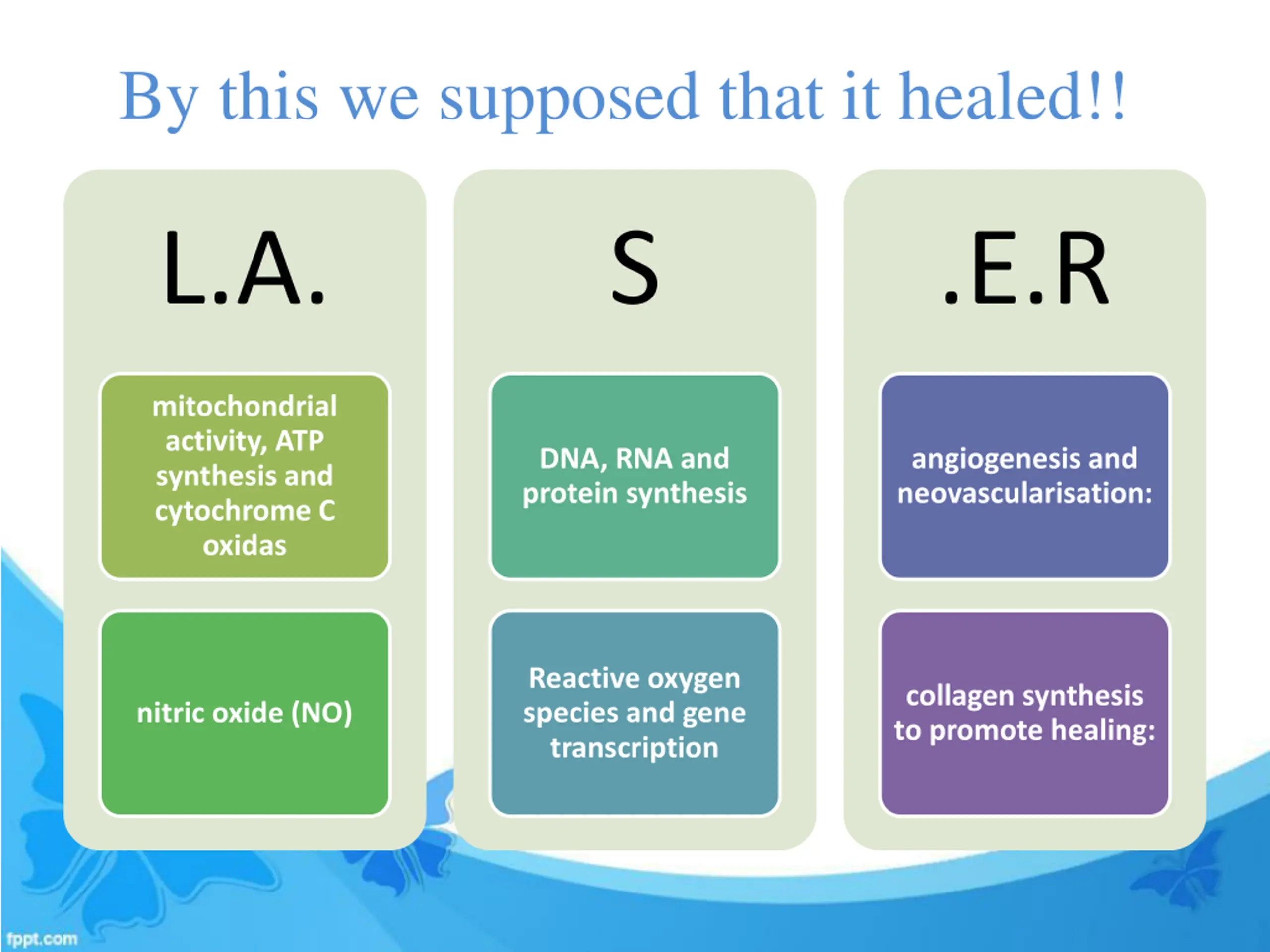 By this we supposed that it healed!! L.A. S .E.R mitochondrial activity, ATP synthesis and cytochrome C oxidas DNA, RNA and protein synthesis angiogenesis and neovascularisation: Reactive oxygen species and gene transcription collagen synthesis to promote healing: nitric oxide (NO)