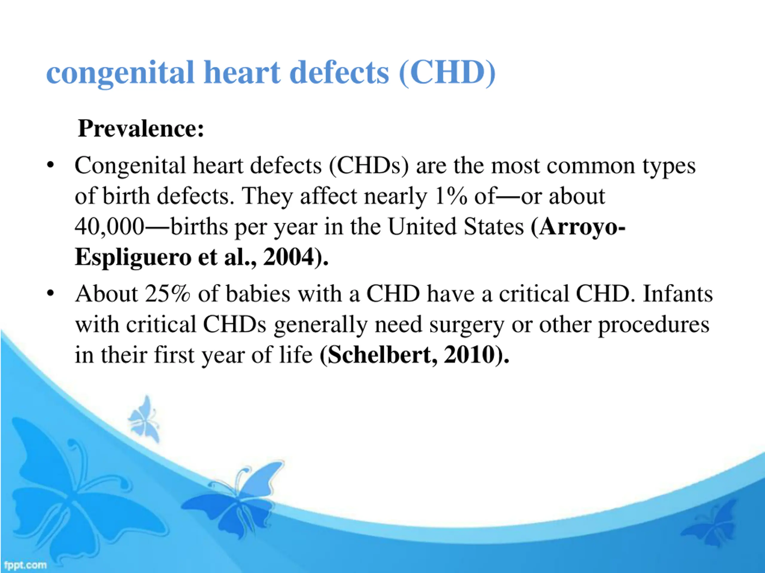 congenital heart defects (CHD) Prevalence: Congenital heart defects (CHDs) are the most common types of birth defects. They affect nearly 1% of or about 40,000 births per year in the United States (Arroyo- Espliguero et al., 2004). About 25% of babies with a CHD have a critical CHD. Infants with critical CHDs generally need surgery or other procedures in their first year of life (Schelbert, 2010).