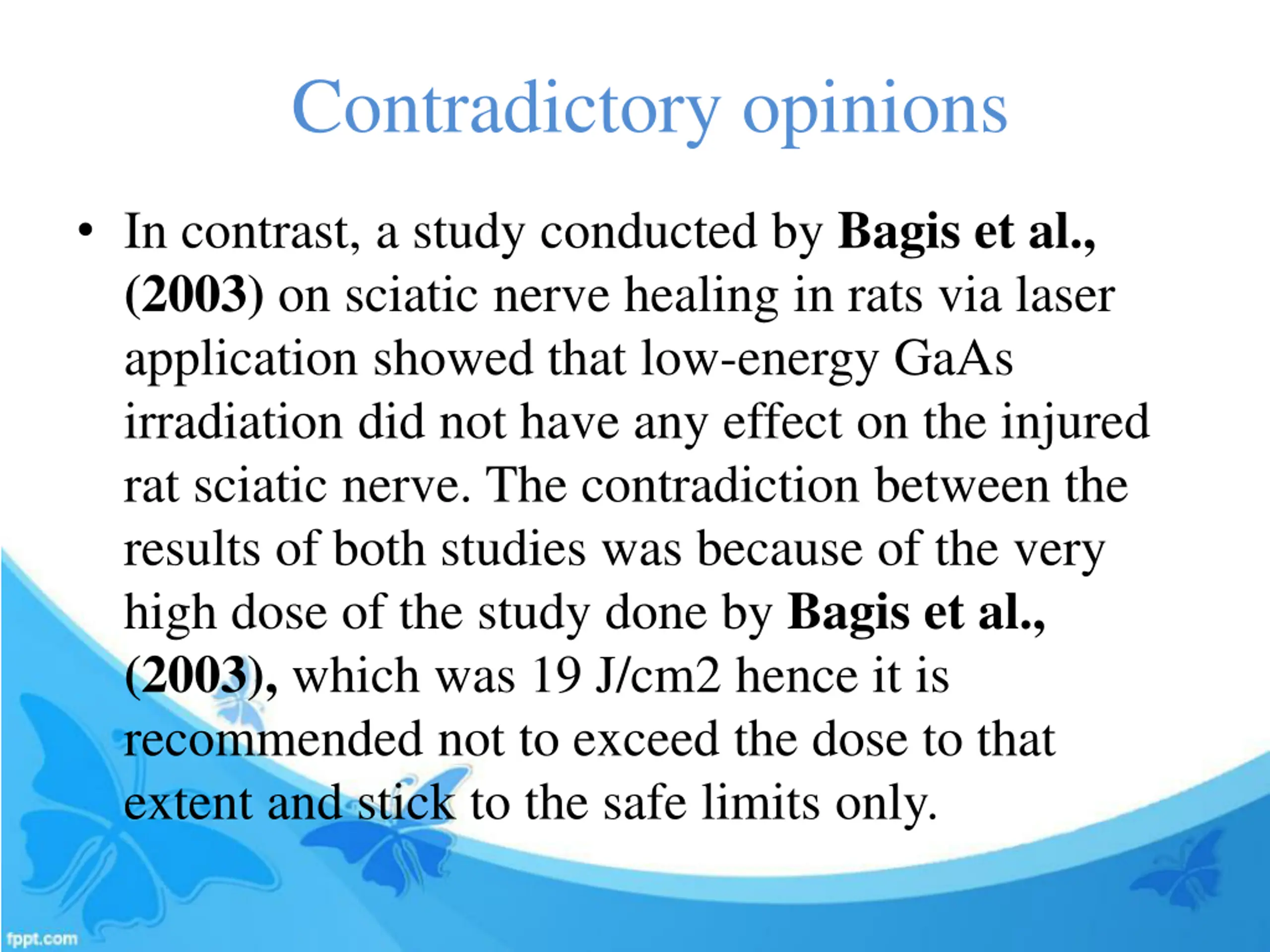 Contradictory opinions In contrast, a study conducted by Bagis et al., (2003)on sciatic nerve healing in rats via laser applicationshowed that low-energy GaAs irradiation did not have any effect on the injured rat sciatic nerve. The contradiction between the results of both studies was because of the very high dose of the study done byBagis et al., (2003),which was 19 J/cm2hence it is recommended not to exceed the dose to that extent and stick to the safe limits only.
