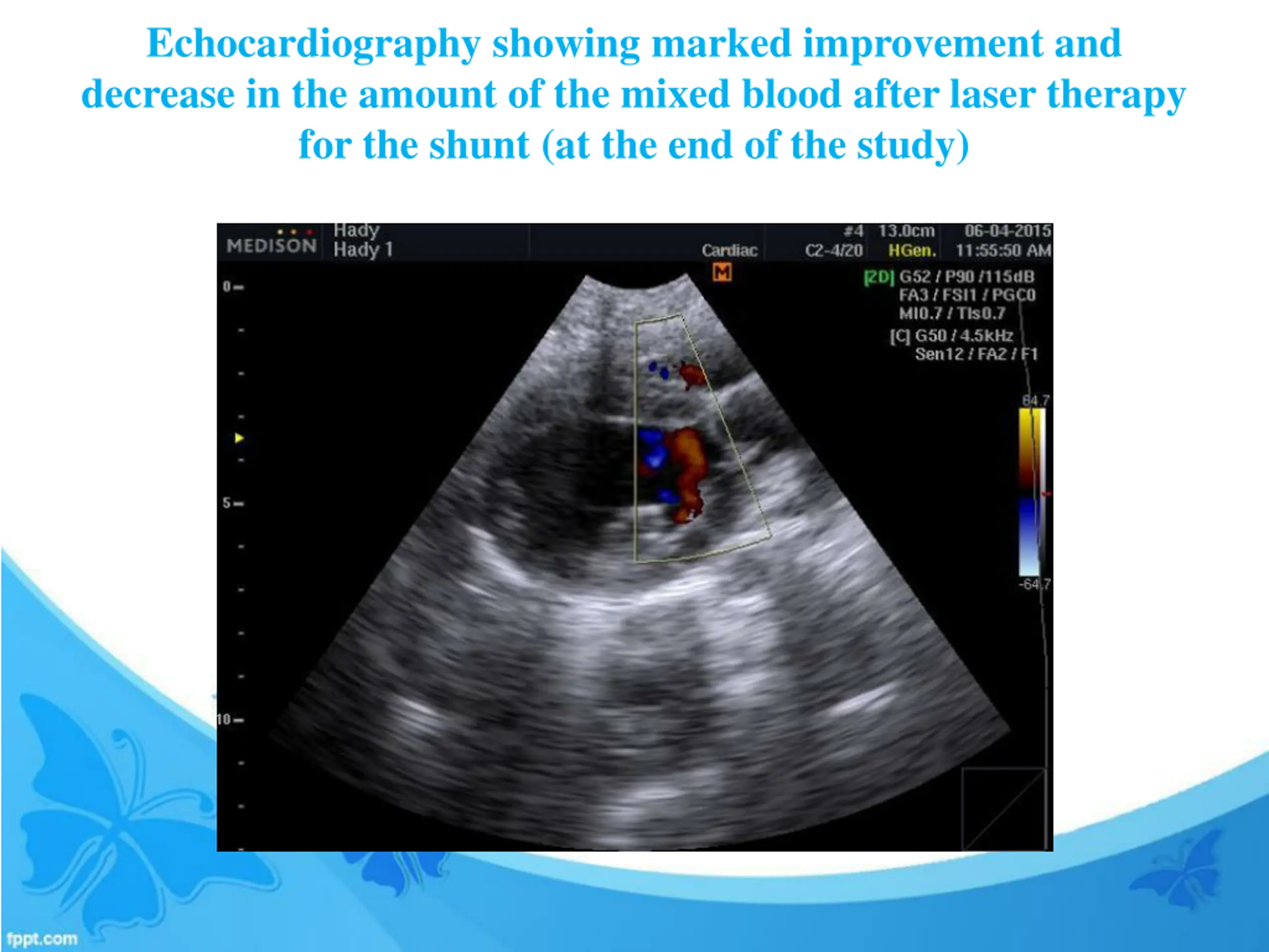 Echocardiography showing marked improvement and decrease in the amount of the mixed blood after laser therapy for the shunt (at the end of the study)