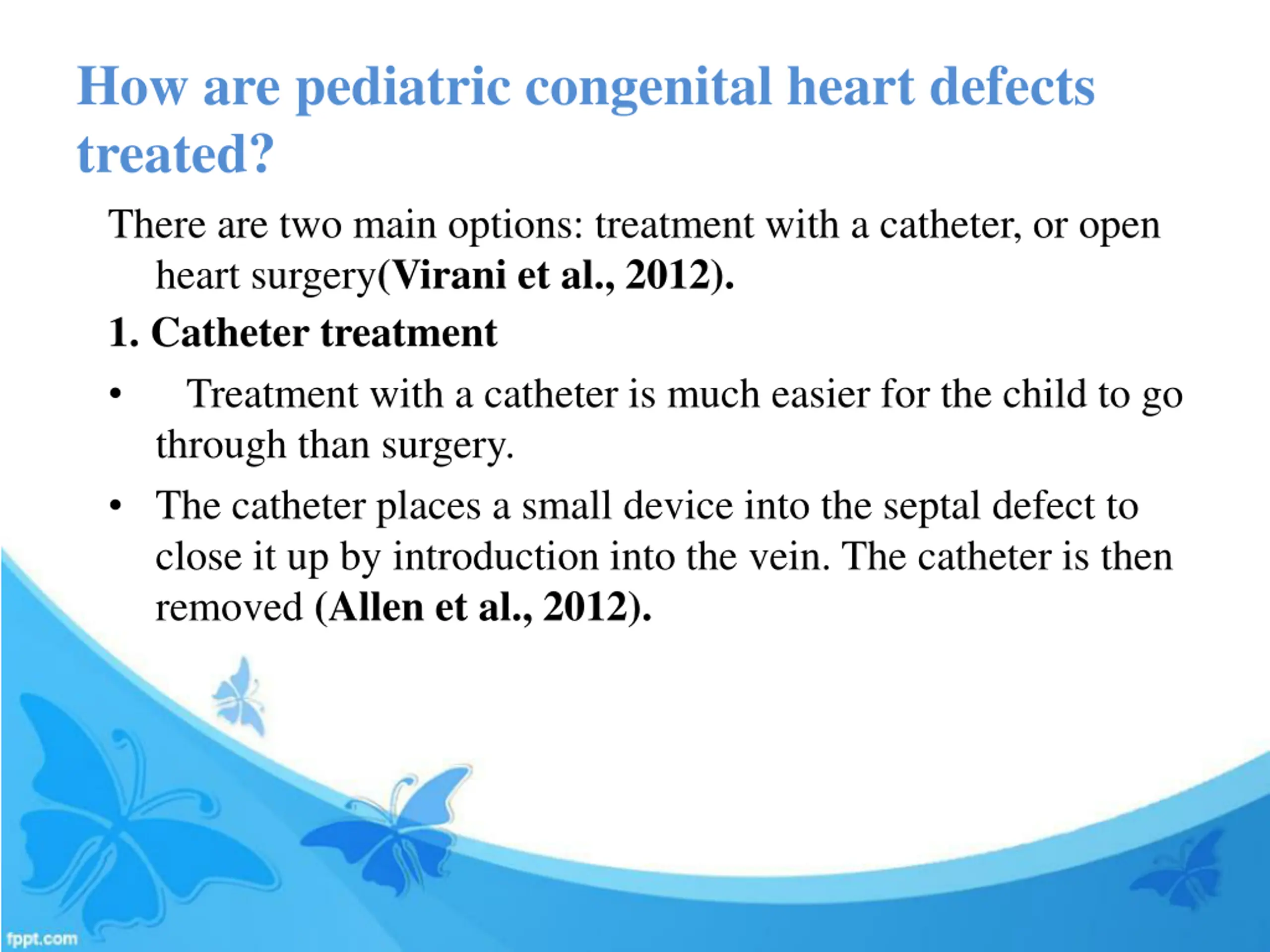 How are pediatric congenital heart defects treated? There are two main options: treatment with a catheter, or open heart surgery(Virani et al., 2012). 1. Catheter treatment Treatment with a catheter is much easier for the child to go through than surgery. The catheter places a small device into the septal defect to close it up by introduction into the vein. The catheter is then removed (Allen et al., 2012).