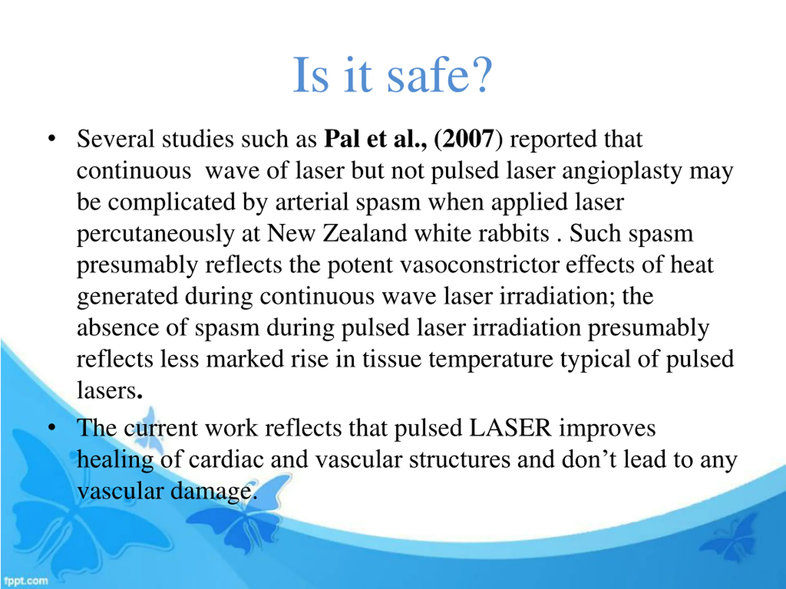 Is it safe? Several studies such as Pal et al., (2007) reported that continuous wave of laser but not pulsed laser angioplasty may be complicated by arterial spasm when applied laser percutaneously at New Zealand white rabbits . Such spasm presumably reflects the potent vasoconstrictor effects of heat generated during continuous wave laser irradiation; the absence of spasm during pulsed laser irradiation presumably reflects less marked rise in tissue temperature typical of pulsed lasers. The current work reflects that pulsed LASER improves healing of cardiac and vascular structures and don t lead to any vascular damage.