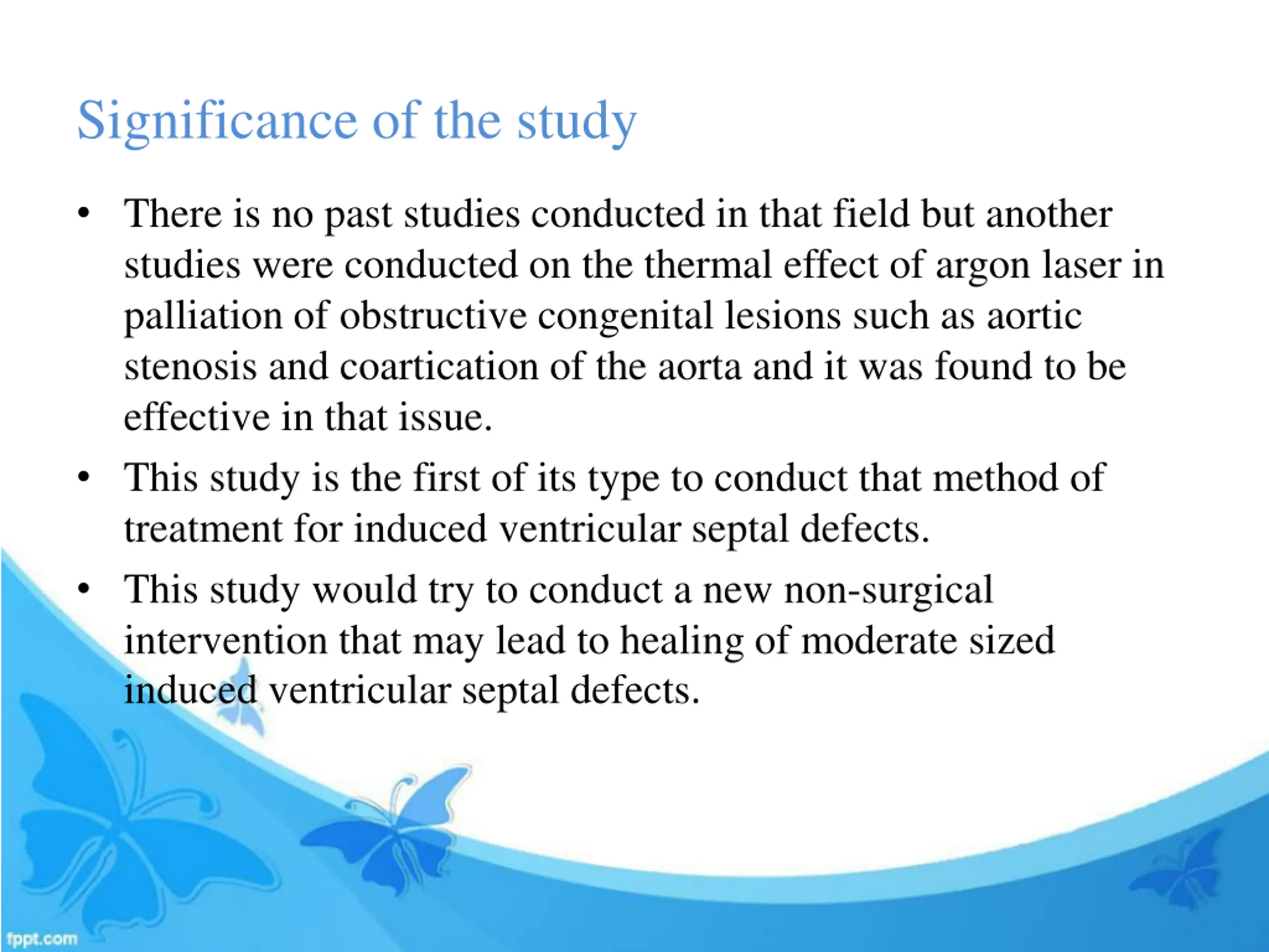 Significance of the study There is no past studies conducted in that field but another studies were conducted on the thermal effect of argon laser in palliation of obstructive congenital lesions such as aortic stenosis and coartication of the aorta and it was found to be effective in that issue. This study is the first of its type to conduct that method of treatment for induced ventricular septal defects. This study would try to conduct a new non-surgical intervention that may lead to healing of moderate sized induced ventricular septal defects.