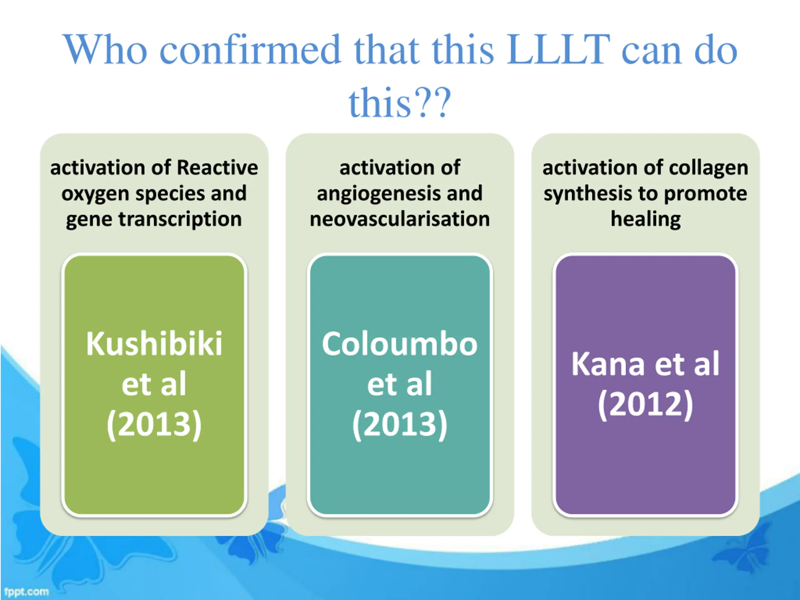 Who confirmed that this LLLT can do this?? activation of Reactive oxygen species and gene transcription activation of angiogenesis and neovascularisation activation of collagen synthesis to promote healing Kushibiki et al (2013) Coloumbo et al (2013) Kana et al (2012)