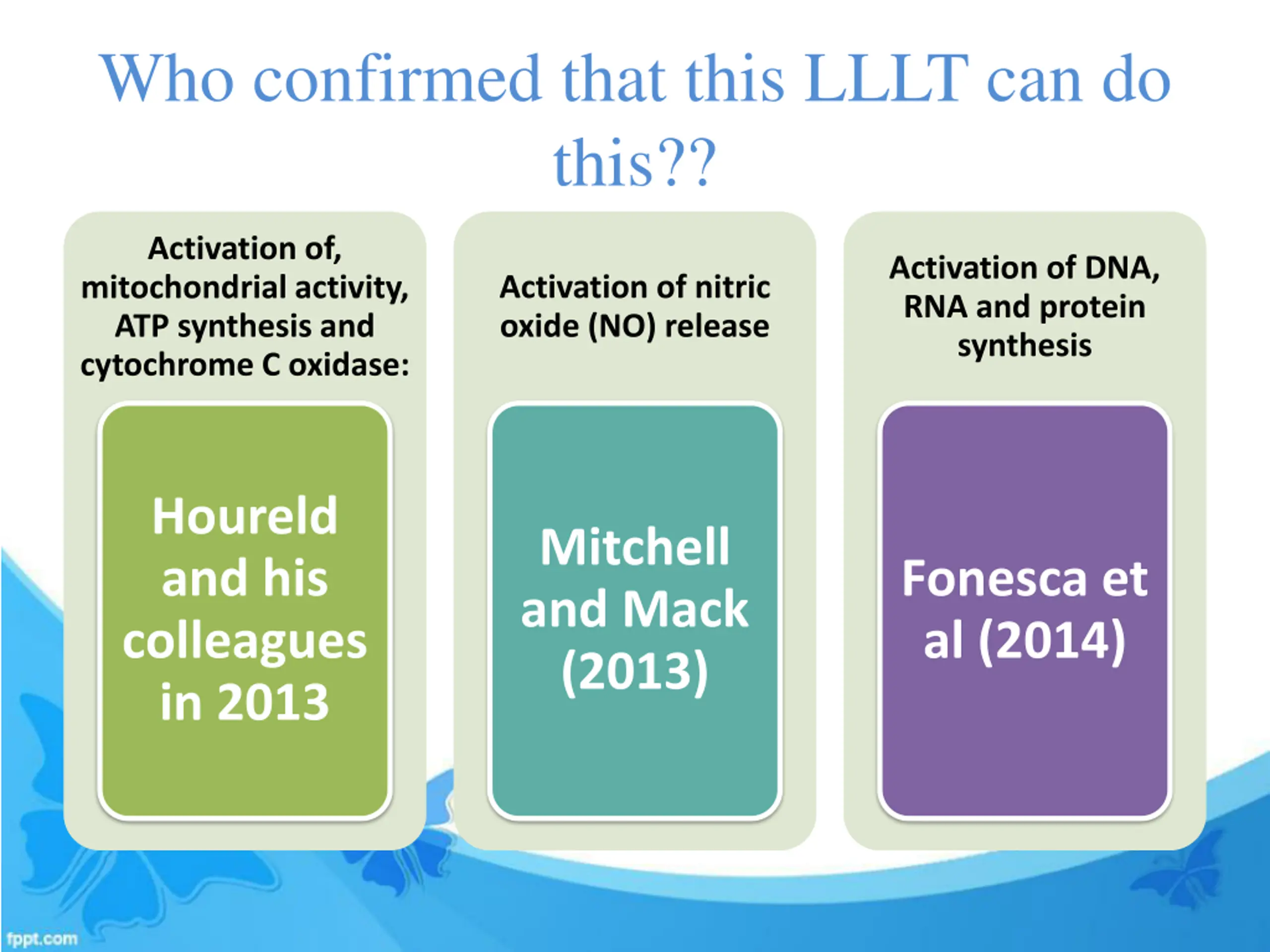 Who confirmed that this LLLT can do this?? Activation of, mitochondrial activity, ATP synthesis and cytochrome C oxidase: Activation of DNA, RNA and protein synthesis Activation of nitric oxide (NO) release Houreld and his colleagues in 2013 Mitchell and Mack (2013) Fonesca et al (2014)