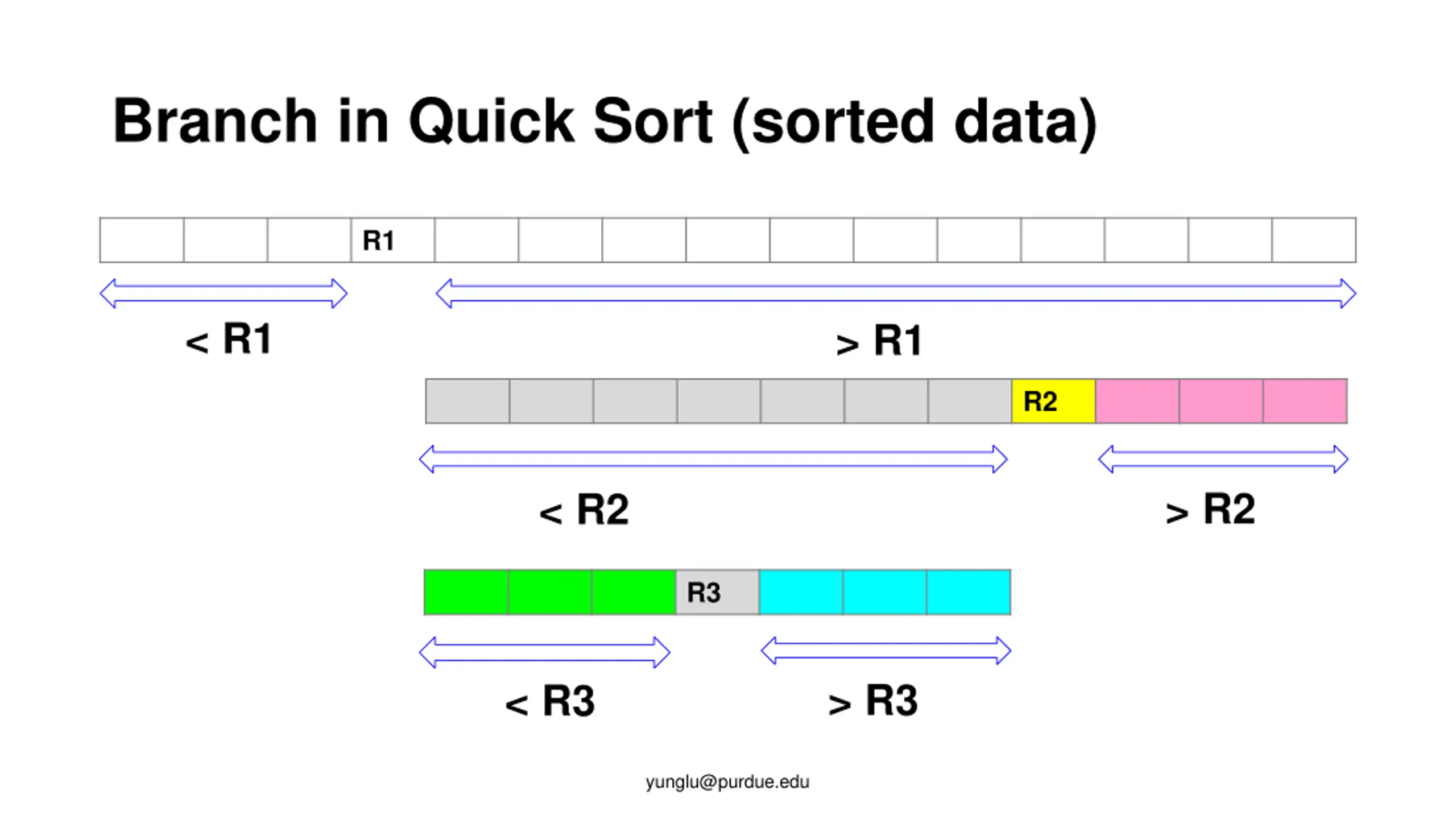 Branch in Quick Sort (sorted data) R1 < R1 > R1 R2 > R2 < R2 R3 > R3 < R3 yunglu@purdue.edu