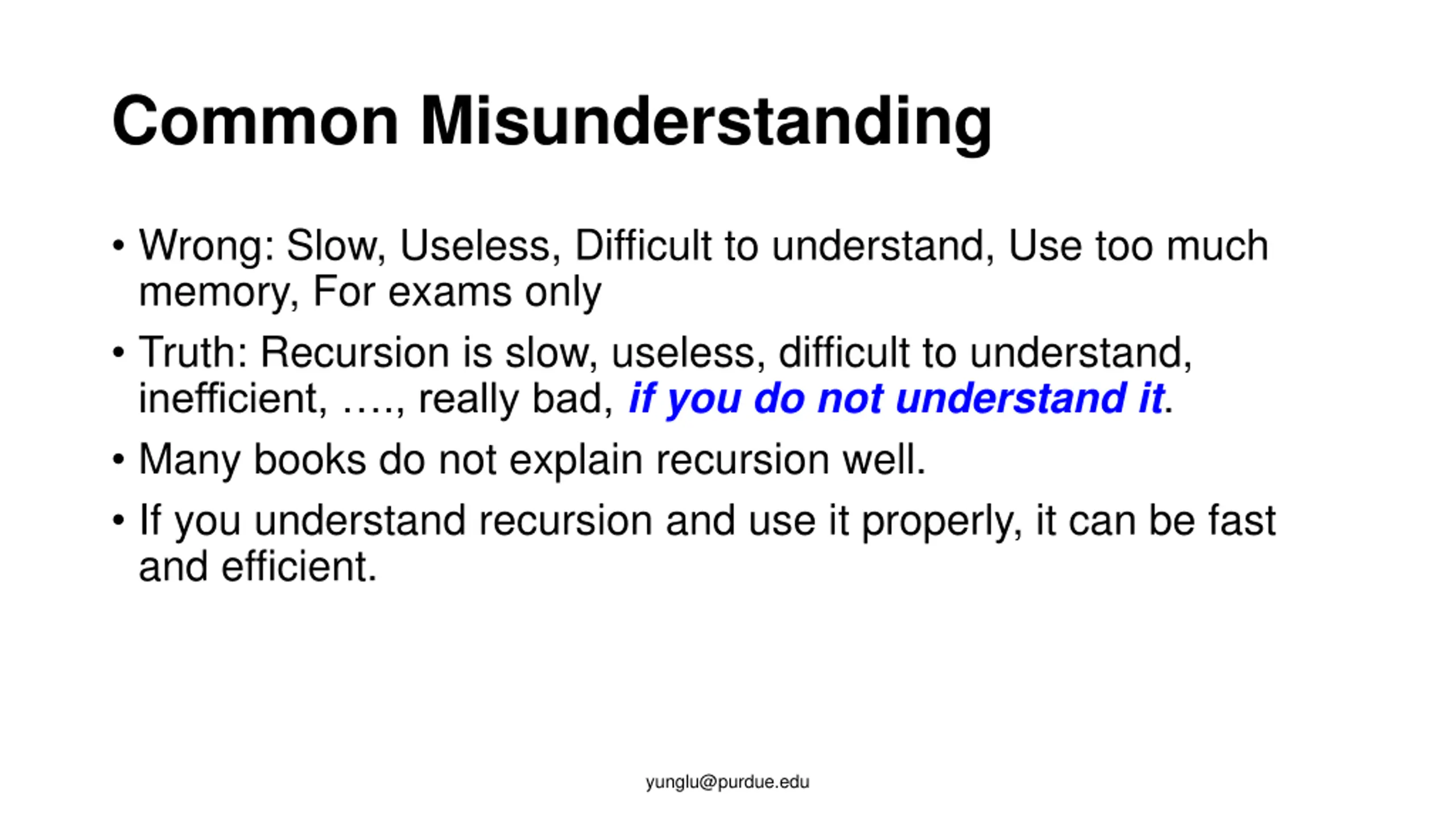 Common Misunderstanding Wrong: Slow, Useless, Difficult to understand, Use too much memory, For exams only Truth: Recursion is slow, useless, difficult to understand, inefficient, ., really bad, if you do not understand it. Many books do not explain recursion well. If you understand recursion and use it properly, it can be fast and efficient. yunglu@purdue.edu
