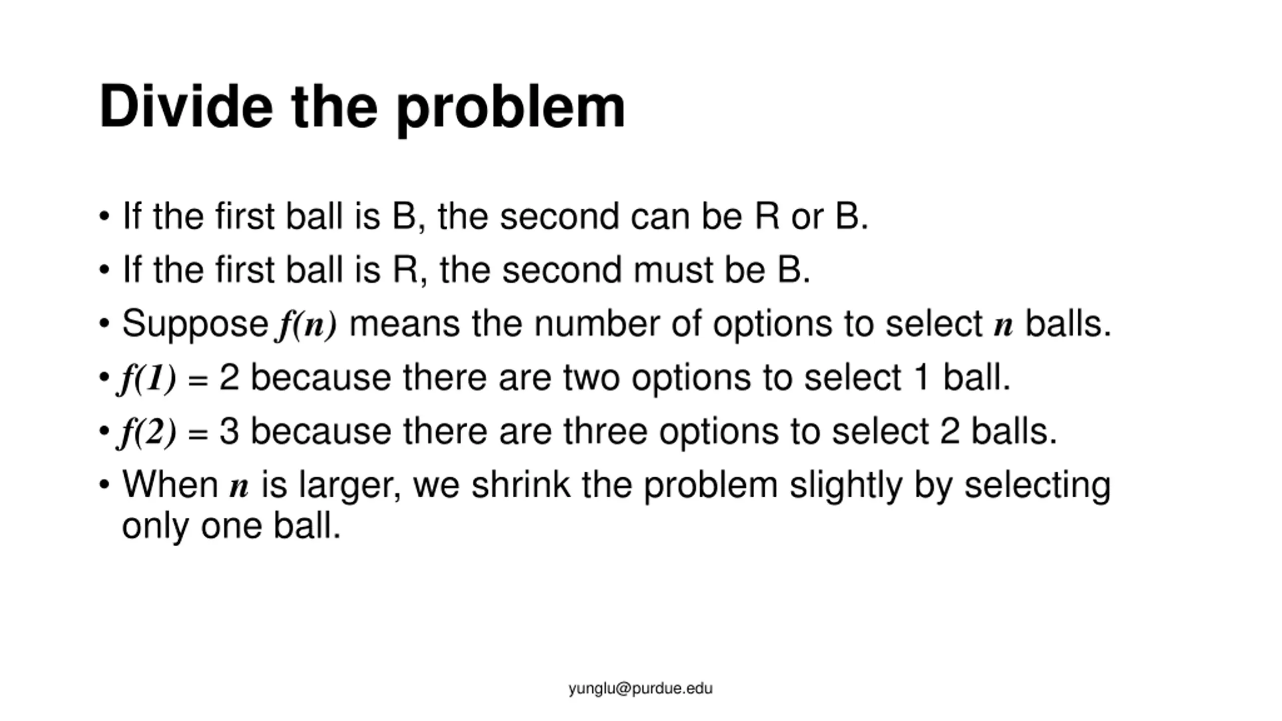 Divide the problem If the first ball is B, the second can be R or B. If the first ball is R, the second must be B. Suppose f(n) means the number of options to select n balls. f(1) = 2 because there are two options to select 1 ball. f(2) = 3 because there are three options to select 2 balls. When n is larger, we shrink the problem slightly by selecting only one ball. yunglu@purdue.edu