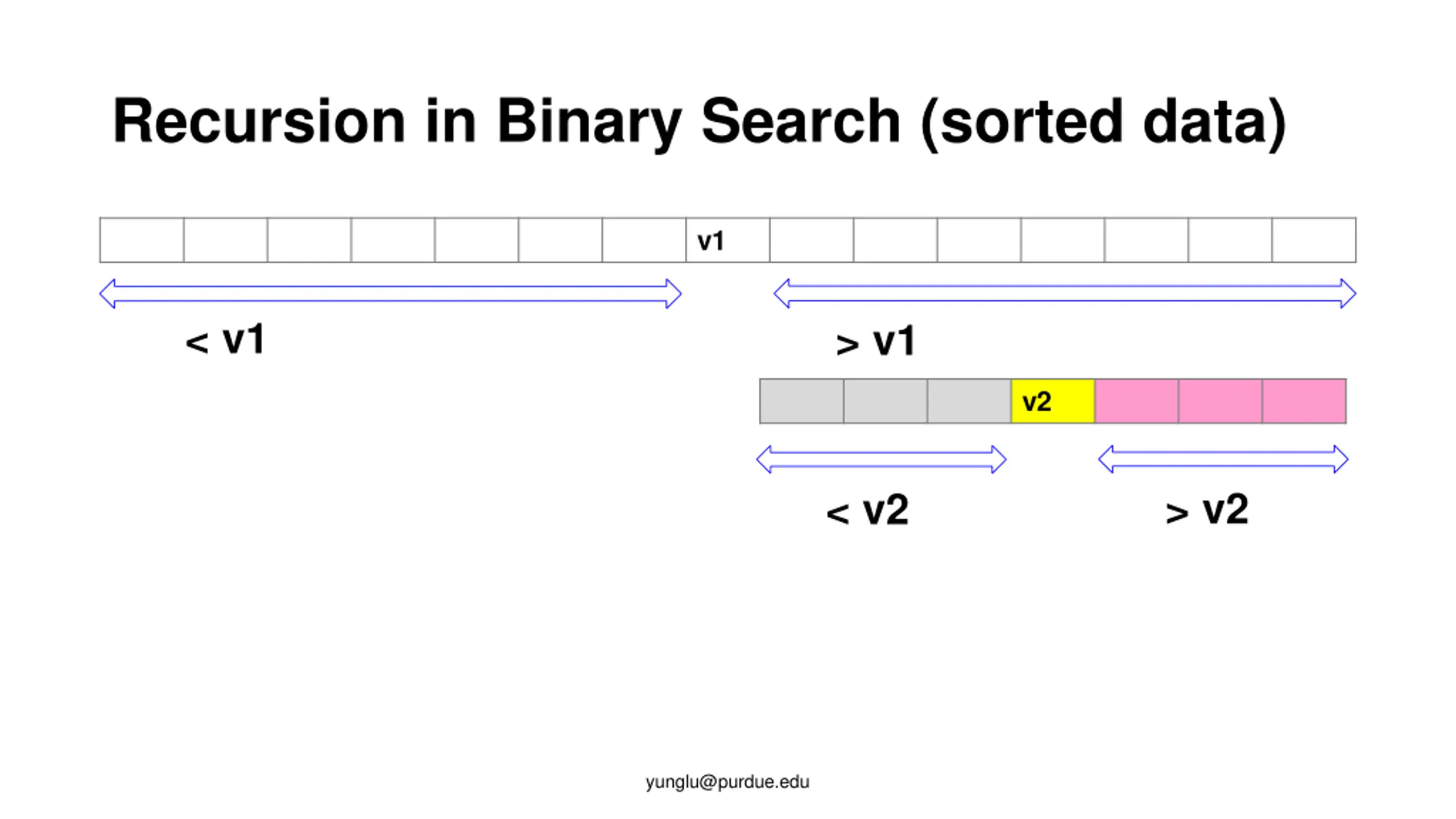 Recursion in Binary Search (sorted data) v1 < v1 > v1 v2 > v2 < v2 yunglu@purdue.edu