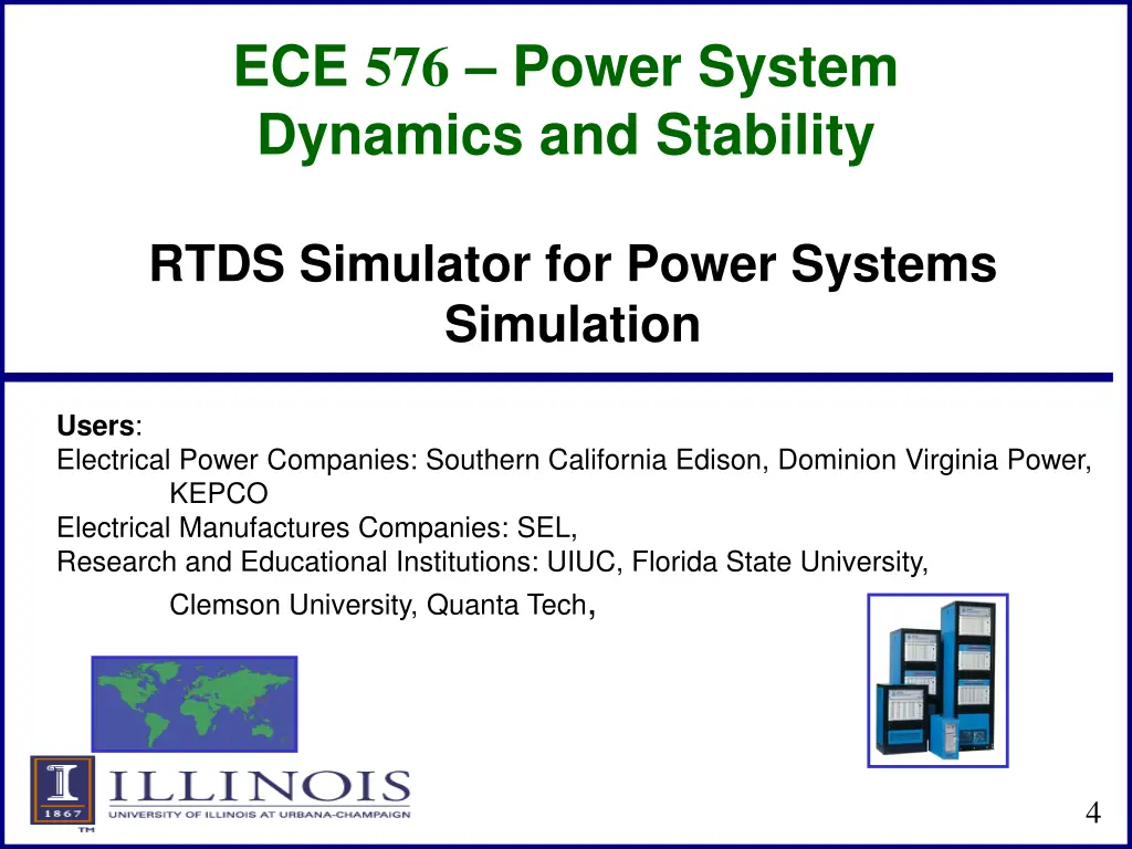 ECE 576 Power System Dynamics and Stability RTDS Simulator for Power Systems Simulation Users: Electrical Power Companies: Southern California Edison, Dominion Virginia Power, KEPCO Electrical Manufactures Companies: SEL, Research and Educational Institutions: UIUC, Florida State University, Clemson University, Quanta Tech, 4