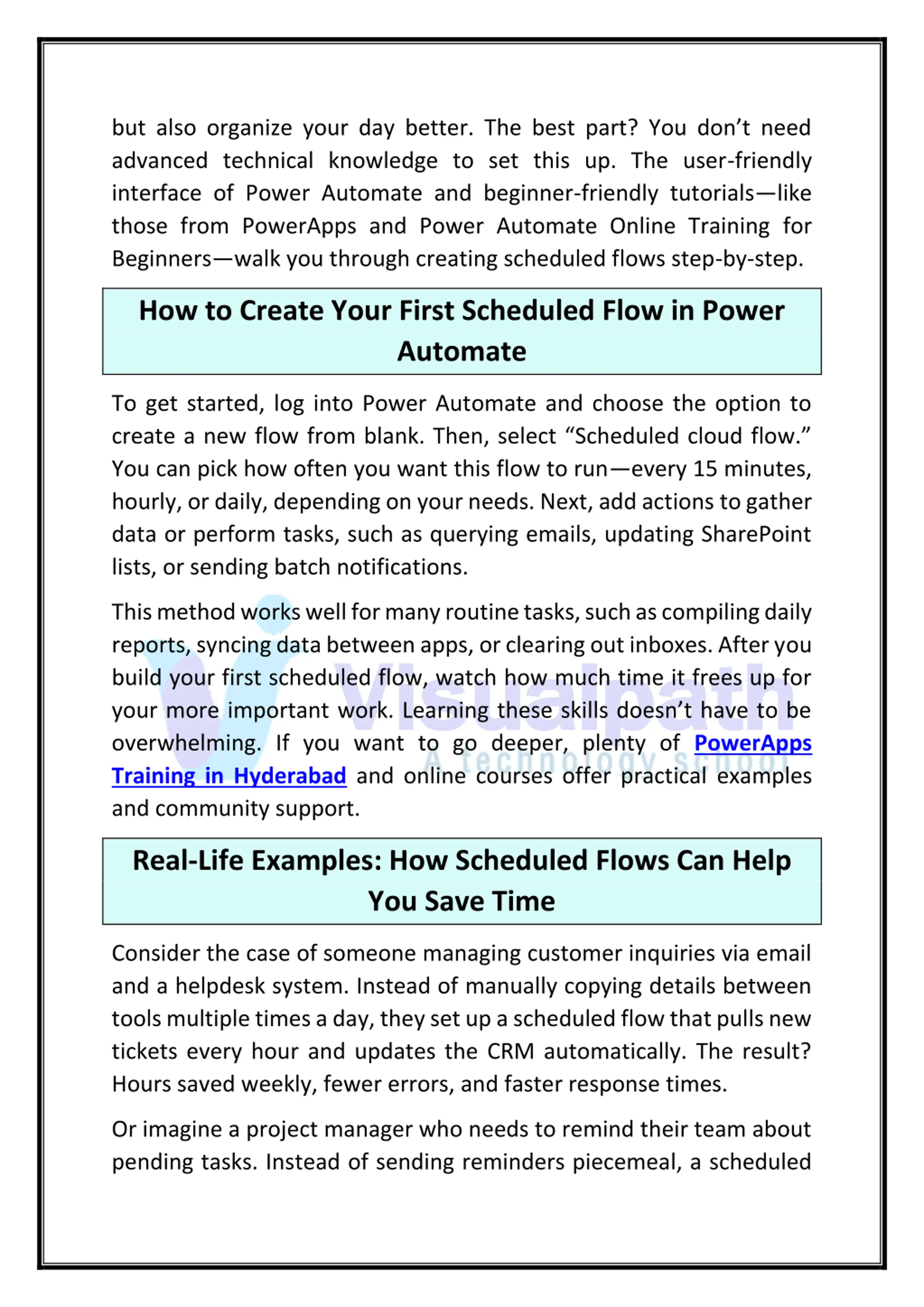 but also organize your day better. The best part? You dont need advanced technical knowledge to set this up. The user-friendly interface of Power Automate and beginner-friendly tutorials like those from PowerApps and Power Automate Online Training for Beginners walk you through creating scheduled flows step-by-step. How to Create Your First Scheduled Flow in Power Automate To get started, log into Power Automate and choose the option to create a new flow from blank. Then, select Scheduled cloud flow. You can pick how often you want this flow to run every 15 minutes, hourly, or daily, depending on your needs. Next, add actions to gather data or perform tasks, such as querying emails, updating SharePoint lists, or sending batch notifications. This method works well for many routine tasks, such as compiling daily reports, syncing data between apps, or clearing out inboxes. After you build your first scheduled flow, watch how much time it frees up for your more important work. Learning these skills doesn t have to be overwhelming. If you want to go deeper, plenty of PowerApps Training in Hyderabad and online courses offer practical examples and community support. Real-Life Examples: How Scheduled Flows Can Help You Save Time Consider the case of someone managing customer inquiries via email and a helpdesk system. Instead of manually copying details between tools multiple times a day, they set up a scheduled flow that pulls new tickets every hour and updates the CRM automatically. The result? Hours saved weekly, fewer errors, and faster response times. Or imagine a project manager who needs to remind their team about pending tasks. Instead of sending reminders piecemeal, a scheduled