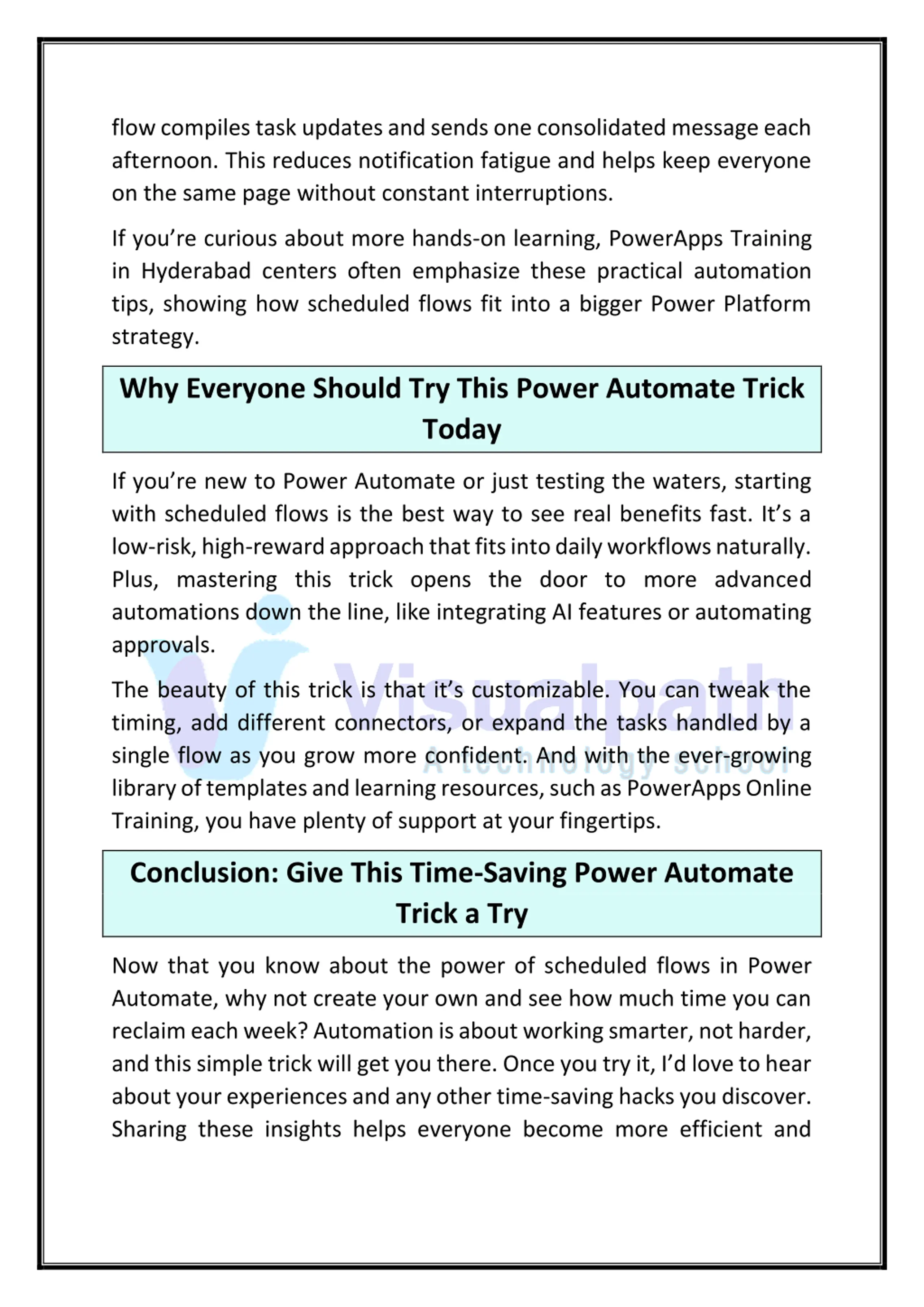 flow compiles task updates and sends one consolidated message each afternoon. This reduces notification fatigue and helps keep everyone on the same page without constant interruptions. If you re curious about more hands-on learning, PowerApps Training in Hyderabad centers often emphasize these practical automation tips, showing how scheduled flows fit into a bigger Power Platform strategy. Why Everyone Should Try This Power Automate Trick Today If you re new to Power Automate or just testing the waters, starting with scheduled flows is the best way to see real benefits fast. It s a low-risk, high-reward approach that fits into daily workflows naturally. Plus, mastering this trick opens the door to more advanced automations down the line, like integrating AI features or automating approvals. The beauty of this trick is that it s customizable. You can tweak the timing, add different connectors, or expand the tasks handled by a single flow as you grow more confident. And with the ever-growing library of templates and learning resources, such as PowerApps Online Training, you have plenty of support at your fingertips. Conclusion: Give This Time-Saving Power Automate Trick a Try Now that you know about the power of scheduled flows in Power Automate, why not create your own and see how much time you can reclaim each week? Automation is about working smarter, not harder, and this simple trick will get you there. Once you try it, I d love to hear about your experiences and any other time-saving hacks you discover. Sharing these insights helps everyone become more efficient and