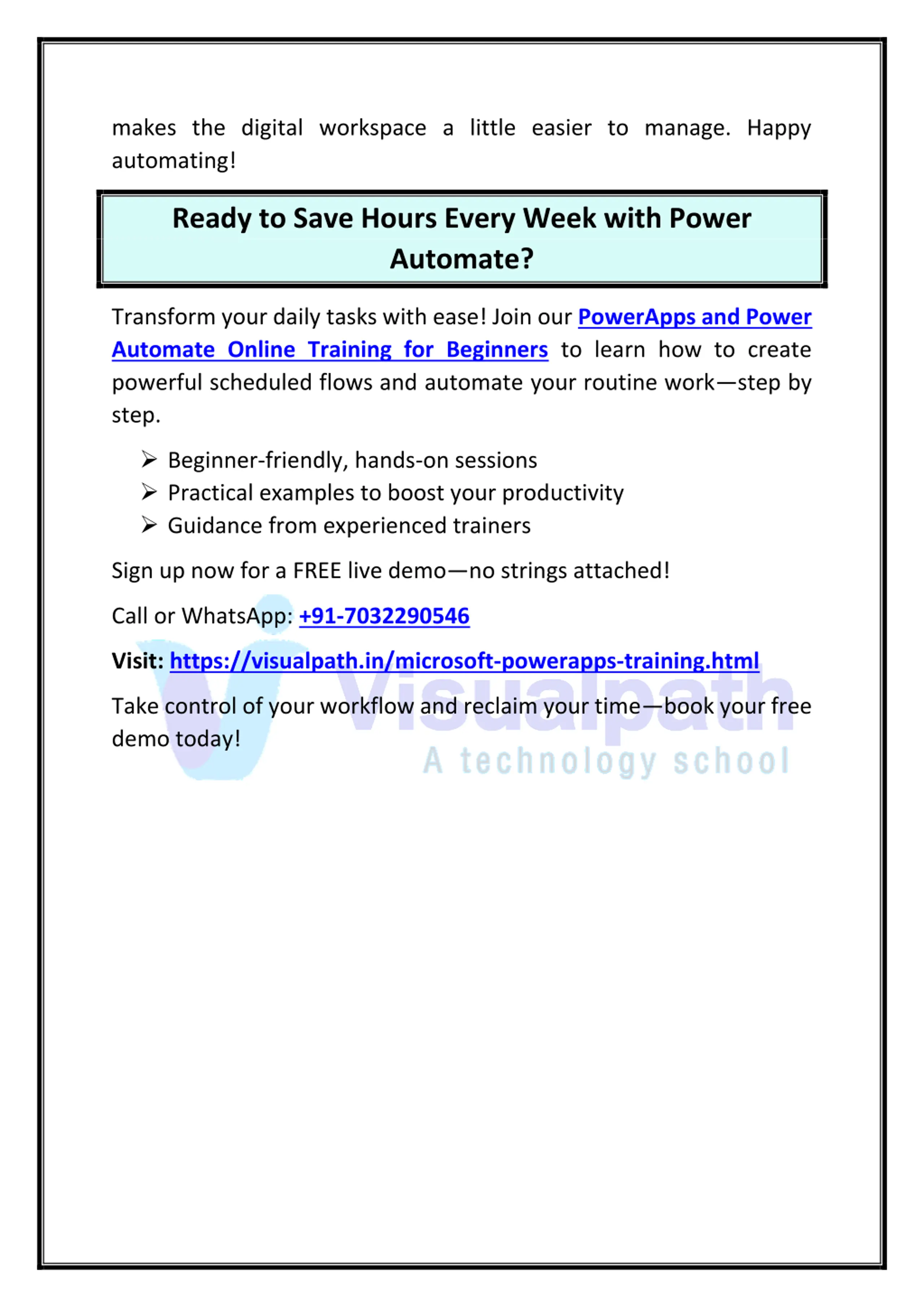 makes the digital workspace a little easier to manage. Happy automating! Ready to Save Hours Every Week with Power Automate? Transform your daily tasks with ease! Join our PowerApps and Power Automate Online Training for Beginners to learn how to create powerful scheduled flows and automate your routine work step by step. Beginner-friendly, hands-on sessions Practical examples to boost your productivity Guidance from experienced trainers Sign up now for a FREE live demo no strings attached! Call or WhatsApp: +91-7032290546 Visit: https://visualpath.in/microsoft-powerapps-training.html Take control of your workflow and reclaim your time book your free demo today!