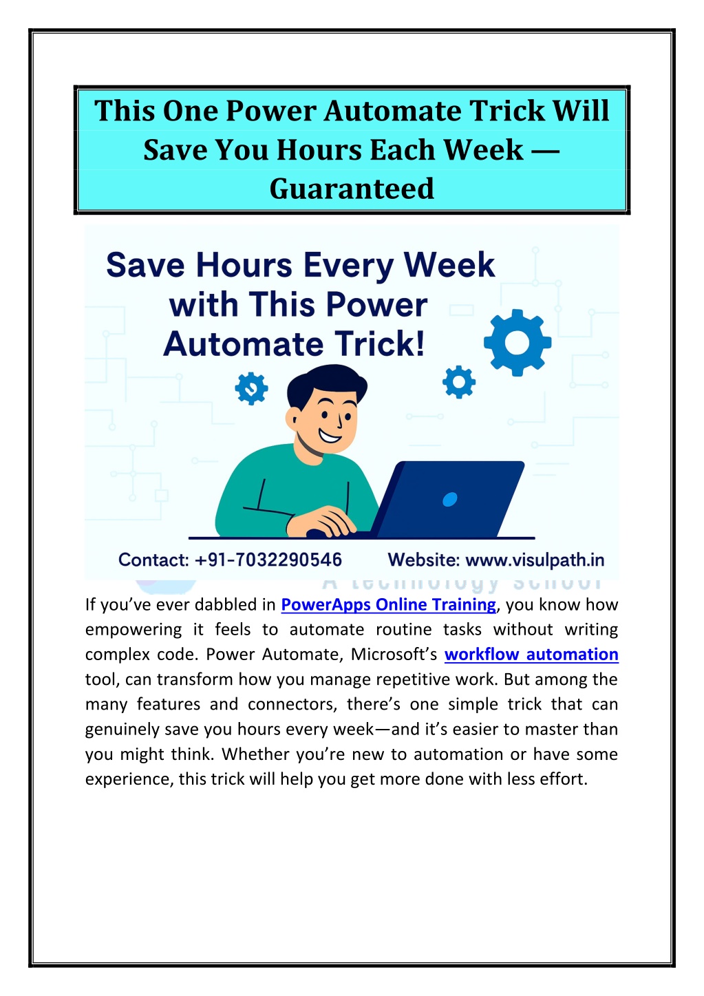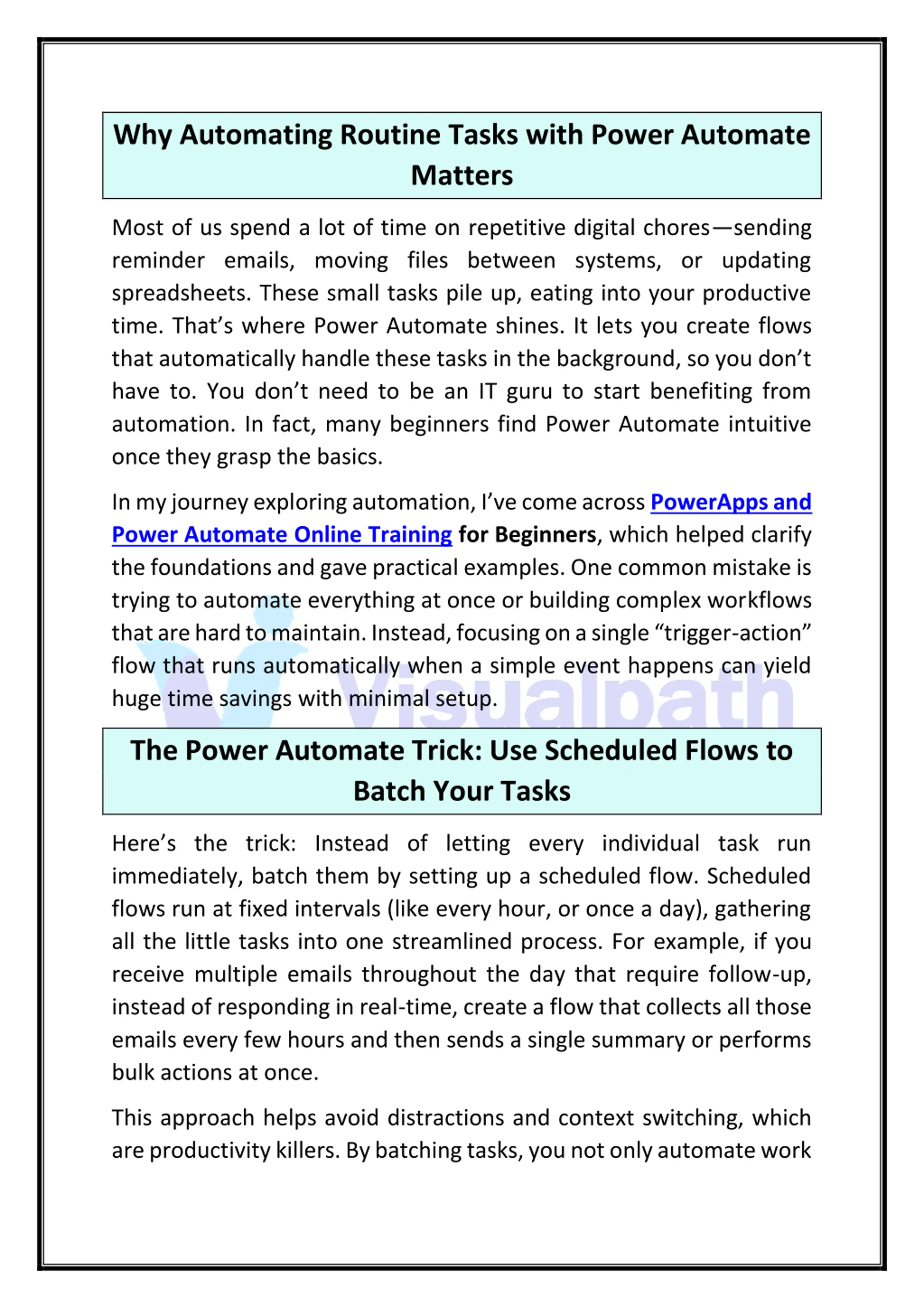 Why Automating Routine Tasks with Power Automate Matters Most of us spend a lot of time on repetitive digital chores sending reminder emails, moving files between systems, or updating spreadsheets. These small tasks pile up, eating into your productive time. That s where Power Automate shines. It lets you create flows that automatically handle these tasks in the background, so you don t have to. You don t need to be an IT guru to start benefiting from automation. In fact, many beginners find Power Automate intuitive once they grasp the basics. In my journey exploring automation, I ve come across PowerApps and Power Automate Online Training for Beginners, which helped clarify the foundations and gave practical examples. One common mistake is trying to automate everything at once or building complex workflows that are hard to maintain. Instead, focusing on a single trigger-action flow that runs automatically when a simple event happens can yield huge time savings with minimal setup. The Power Automate Trick: Use Scheduled Flows to Batch Your Tasks Here s the trick: Instead of letting every individual task run immediately, batch them by setting up a scheduled flow. Scheduled flows run at fixed intervals (like every hour, or once a day), gathering all the little tasks into one streamlined process. For example, if you receive multiple emails throughout the day that require follow-up, instead of responding in real-time, create a flow that collects all those emails every few hours and then sends a single summary or performs bulk actions at once. This approach helps avoid distractions and context switching, which are productivity killers. By batching tasks, you not only automate work