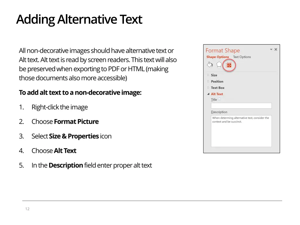 Adding Alternative Text All non-decorative images should have alternative text or Alt text. Alt text is read by screen readers. This text will also be preserved when exporting to PDF or HTML (making those documents also more accessible) To add alt text to a non-decorative image: 1. Right-click the image 2. Choose FormatPicture 3. Select Size & Properties icon 4. Choose AltText 5. In the Description field enter proper alt text 12
