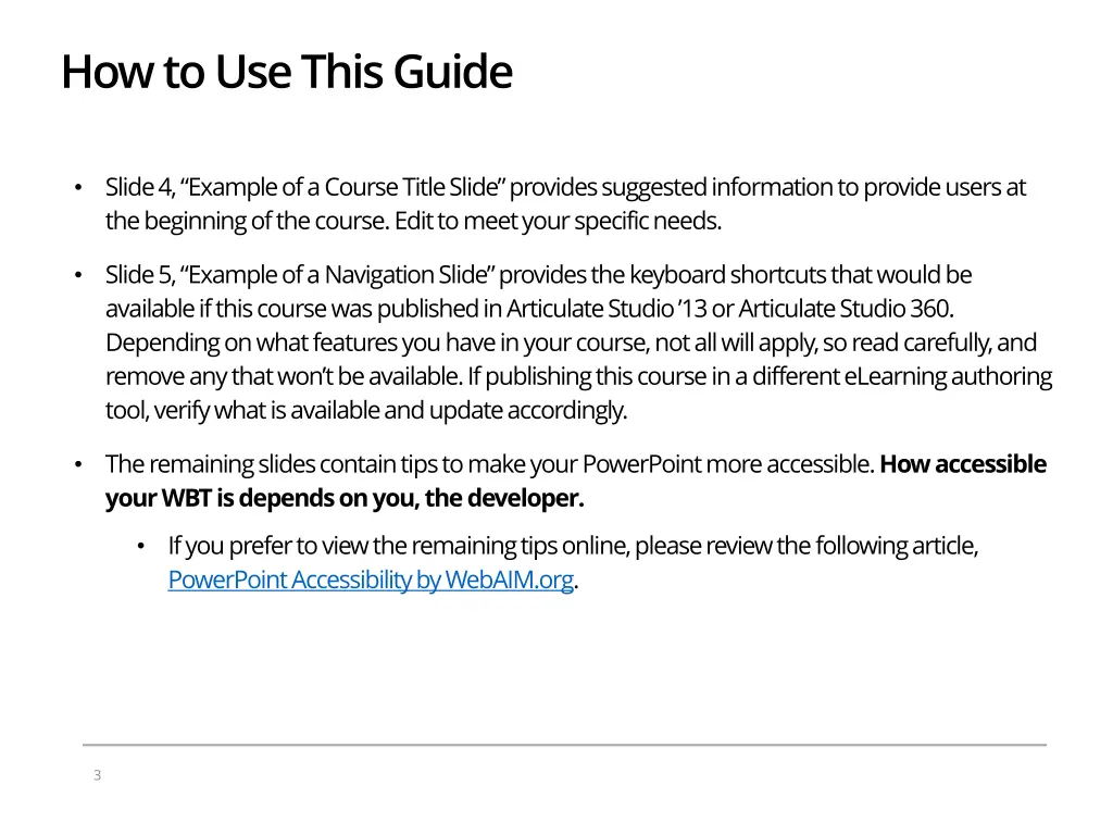 How to Use This Guide Slide 4, Example of a Course Title Slide provides suggested information to provide users at the beginning of the course. Edit to meet your specific needs. Slide 5, Example of a Navigation Slide provides the keyboard shortcuts that would be available if this course was published in Articulate Studio 13 or Articulate Studio 360. Depending on what features you have in your course, not all will apply, so read carefully, and remove any that won t be available. If publishing this course in a different eLearning authoring tool, verify what is available and update accordingly. The remaining slides contain tips to make your PowerPoint more accessible. How accessible your WBT is depends on you, the developer. If you prefer to view the remaining tips online, please review the following article, PowerPoint Accessibility by WebAIM.org. 3