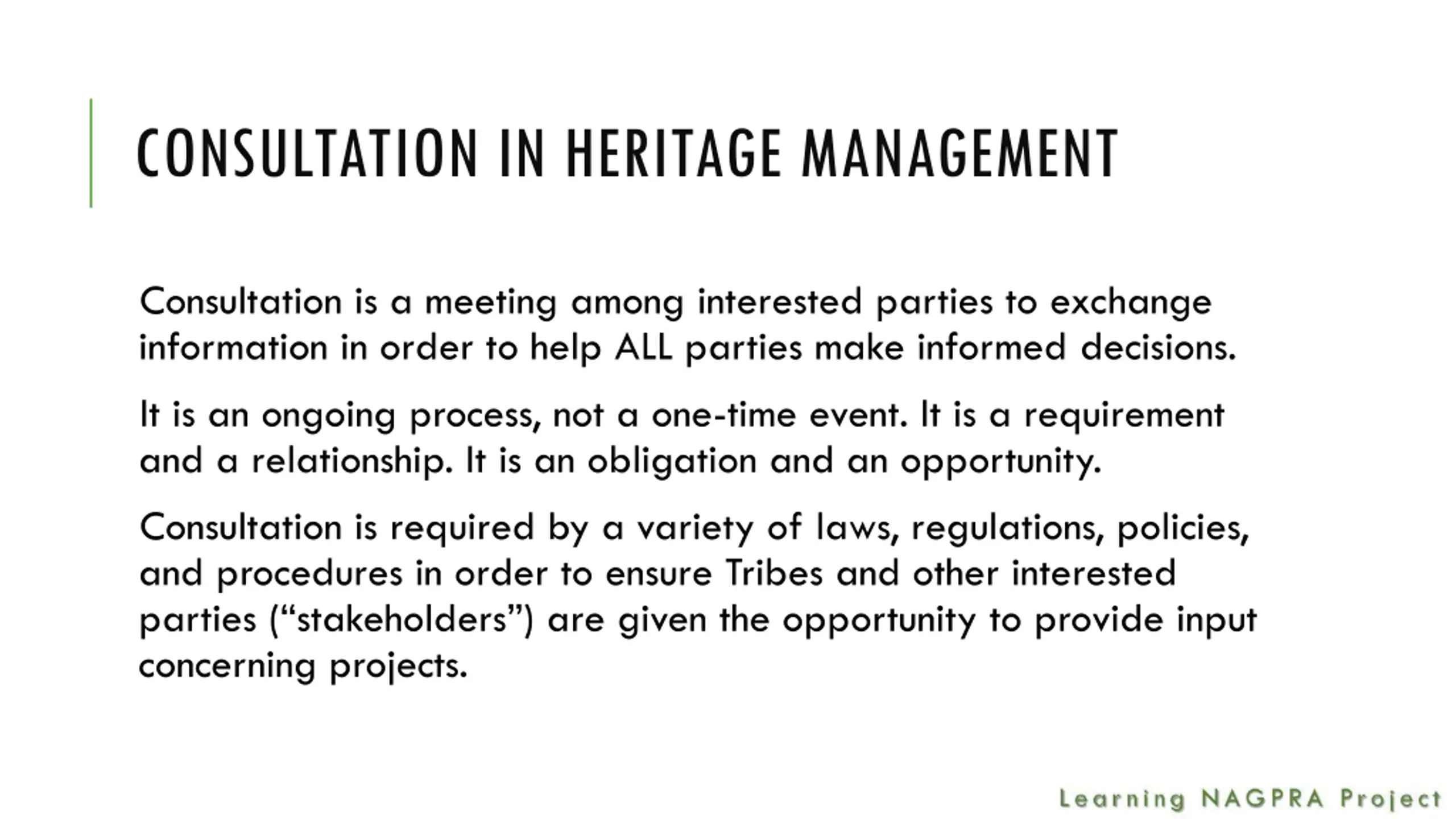 CONSULTATION IN HERITAGE MANAGEMENT Consultation is a meeting among interested parties to exchange information in order to help ALL parties make informed decisions. It is an ongoing process, not a one-time event. It is a requirement and a relationship. It is an obligation and an opportunity. Consultation is required by a variety of laws, regulations, policies, and procedures in order to ensure Tribes and other interested parties ( stakeholders ) are given the opportunity to provide input concerning projects.