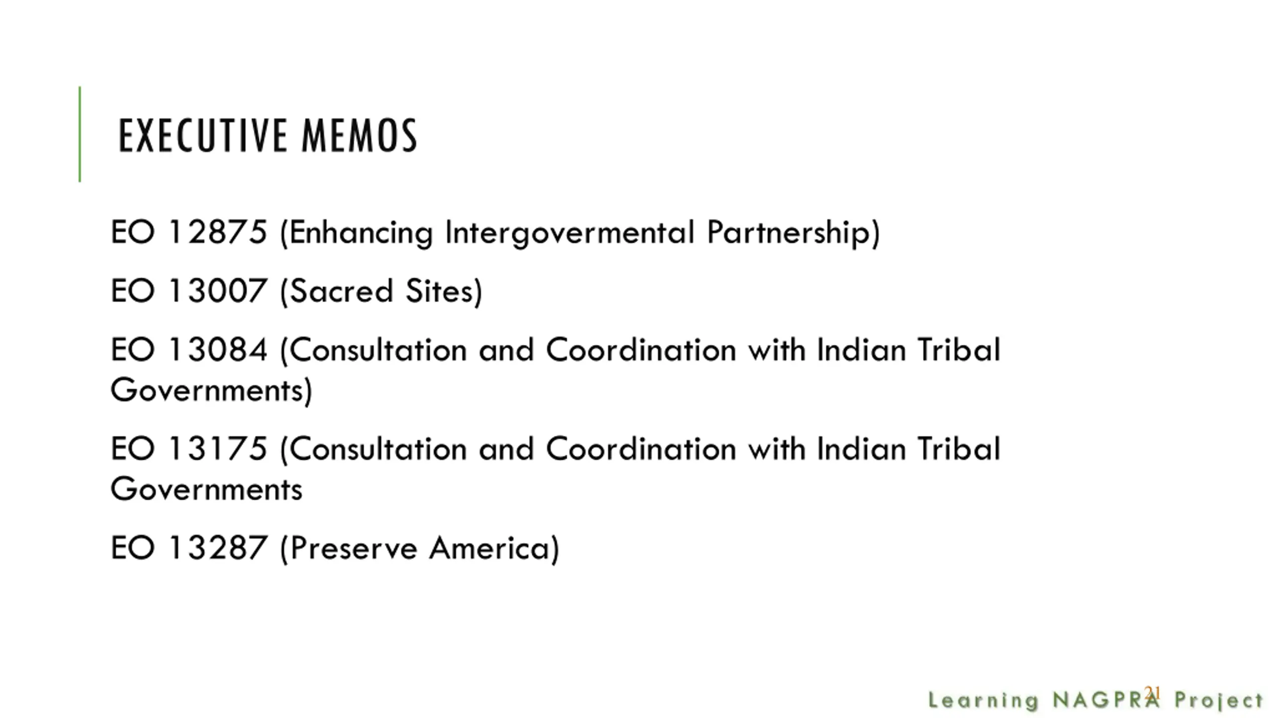 EXECUTIVE MEMOS EO 12875 (Enhancing Intergovermental Partnership) EO 13007 (Sacred Sites) EO 13084 (Consultation and Coordination with Indian Tribal Governments) EO 13175 (Consultation and Coordination with Indian Tribal Governments EO 13287 (Preserve America) 21