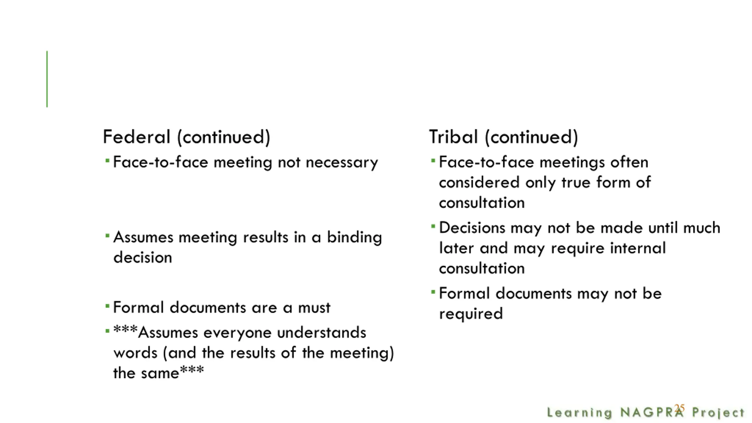 Federal (continued) Face-to-face meeting not necessary Tribal (continued) Face-to-face meetings often considered only true form of consultation Decisions may not be made until much later and may require internal consultation Formal documents may not be required Assumes meeting results in a binding decision Formal documents are a must ***Assumes everyone understands words (and the results of the meeting) the same*** 25