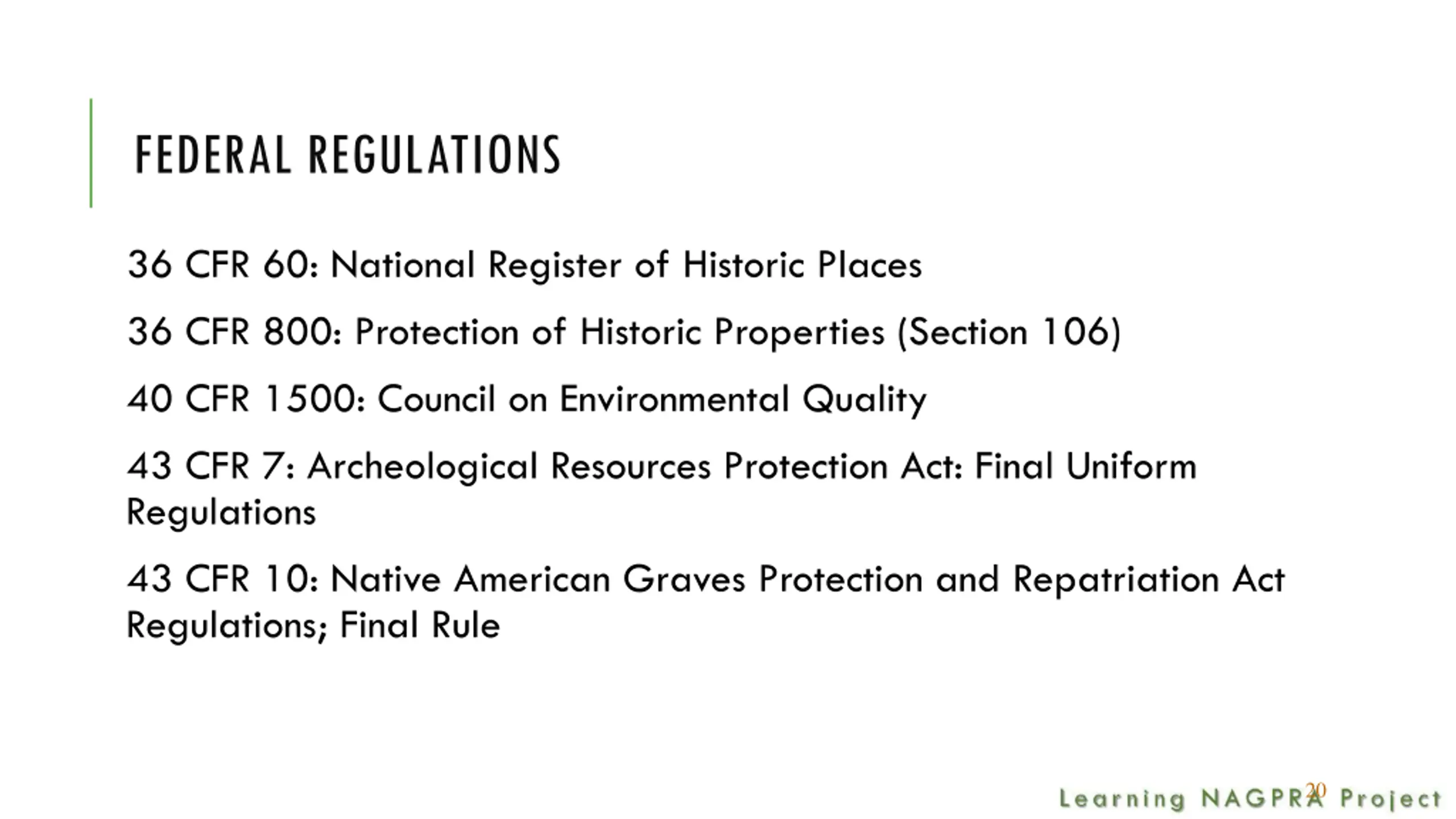 FEDERAL REGULATIONS 36 CFR 60: National Register of Historic Places 36 CFR 800: Protection of Historic Properties (Section 106) 40 CFR 1500: Council on Environmental Quality 43 CFR 7: Archeological Resources Protection Act: Final Uniform Regulations 43 CFR 10: Native American Graves Protection and Repatriation Act Regulations; Final Rule 20