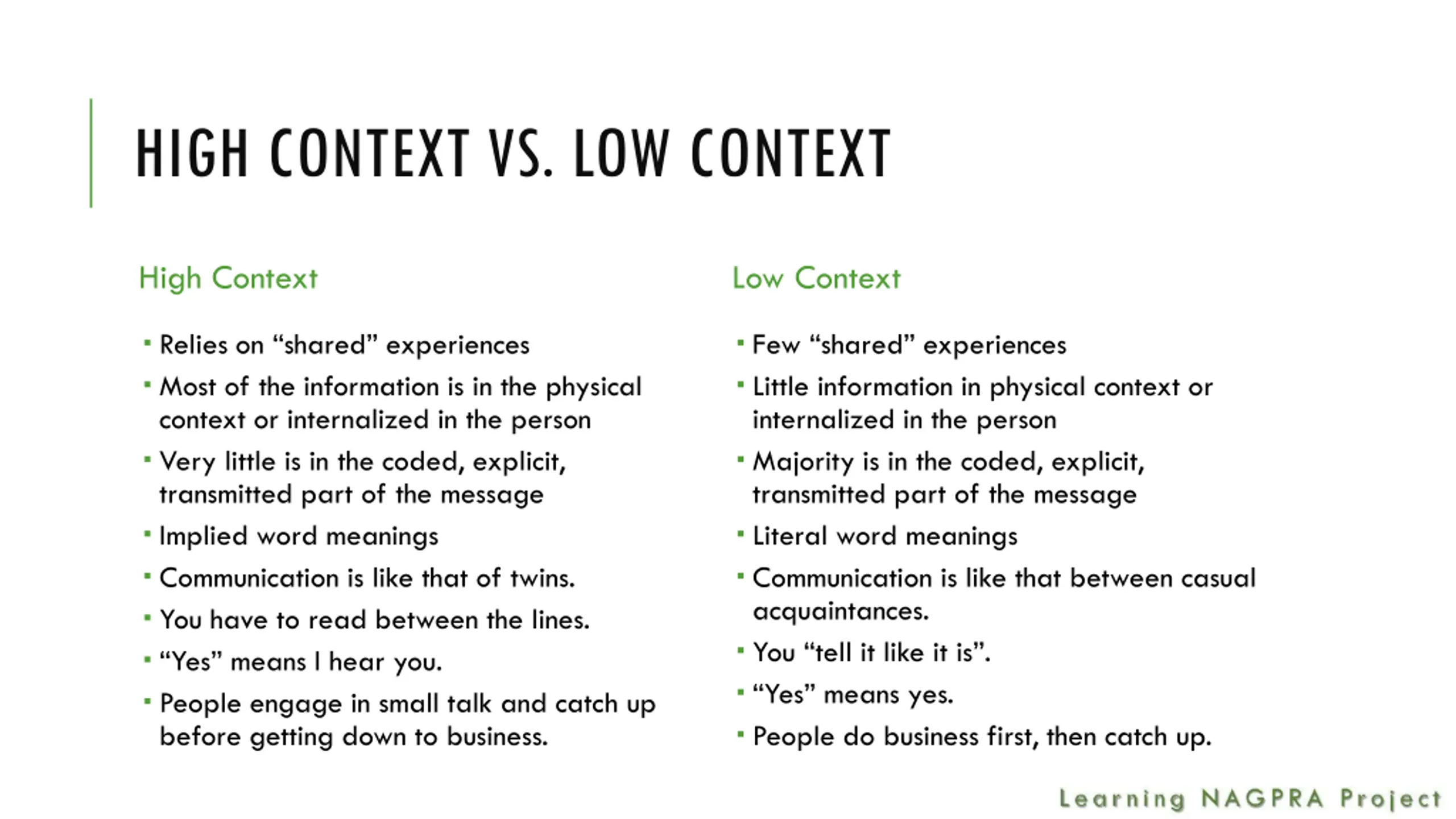 HIGH CONTEXT VS. LOW CONTEXT High Context Low Context Relies on shared experiences Most of the information is in the physical context or internalized in the person Very little is in the coded, explicit, transmitted part of the message Implied word meanings Communication is like that of twins. You have to read between the lines. Yes means I hear you. People engage in small talk and catch up before getting down to business. Few shared experiences Little information in physical context or internalized in the person Majority is in the coded, explicit, transmitted part of the message Literal word meanings Communication is like that between casual acquaintances. You tell it like it is . Yes means yes. People do business first, then catch up.