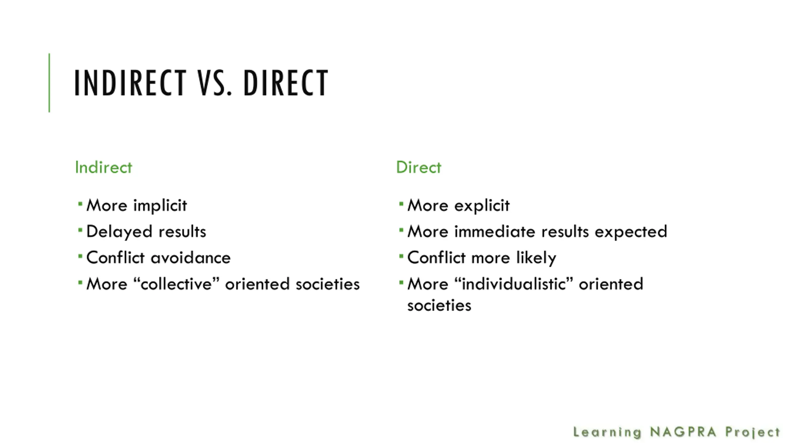 INDIRECT VS. DIRECT Indirect Direct More implicit Delayed results Conflict avoidance More collective oriented societies More explicit More immediate results expected Conflict more likely More individualistic oriented societies