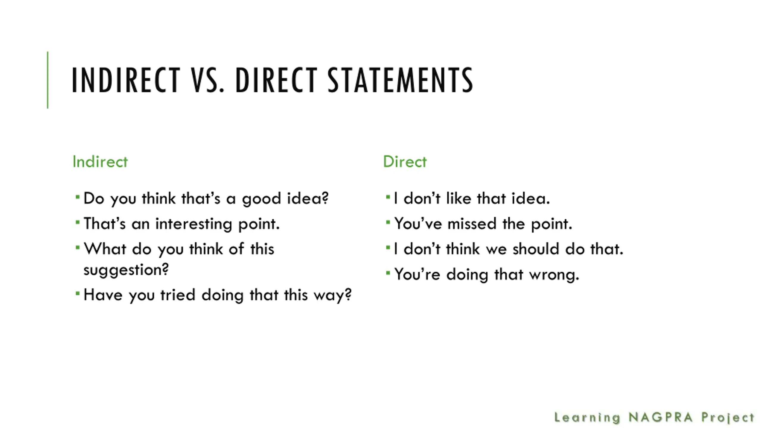 INDIRECT VS. DIRECT STATEMENTS Indirect Direct Do you think that s a good idea? That s an interesting point. What do you think of this suggestion? Have you tried doing that this way? I don t like that idea. You ve missed the point. I don t think we should do that. You re doing that wrong.