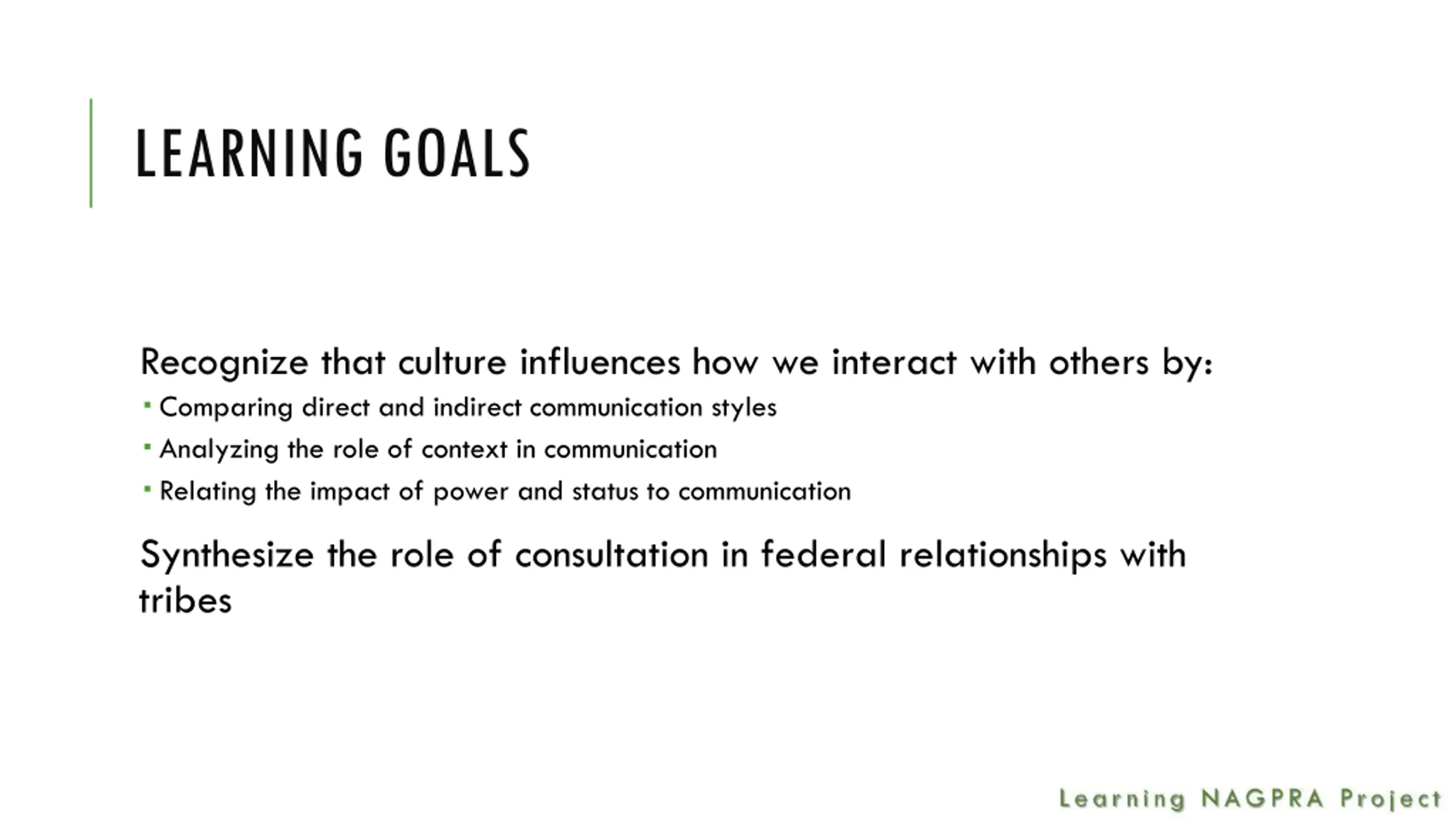 LEARNING GOALS Recognize that culture influences how we interact with others by: Comparing direct and indirect communication styles Analyzing the role of context in communication Relating the impact of power and status to communication Synthesize the role of consultation in federal relationships with tribes