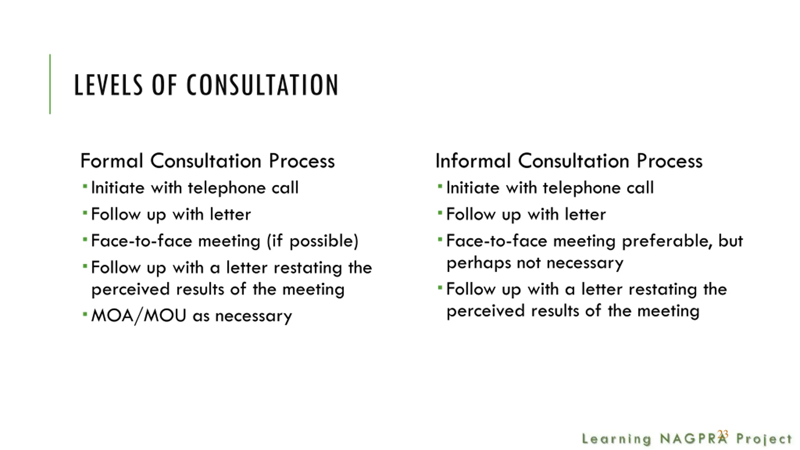 LEVELS OF CONSULTATION Formal Consultation Process Initiate with telephone call Follow up with letter Face-to-face meeting (if possible) Follow up with a letter restating the perceived results of the meeting MOA/MOU as necessary Informal Consultation Process Initiate with telephone call Follow up with letter Face-to-face meeting preferable, but perhaps not necessary Follow up with a letter restating the perceived results of the meeting 23