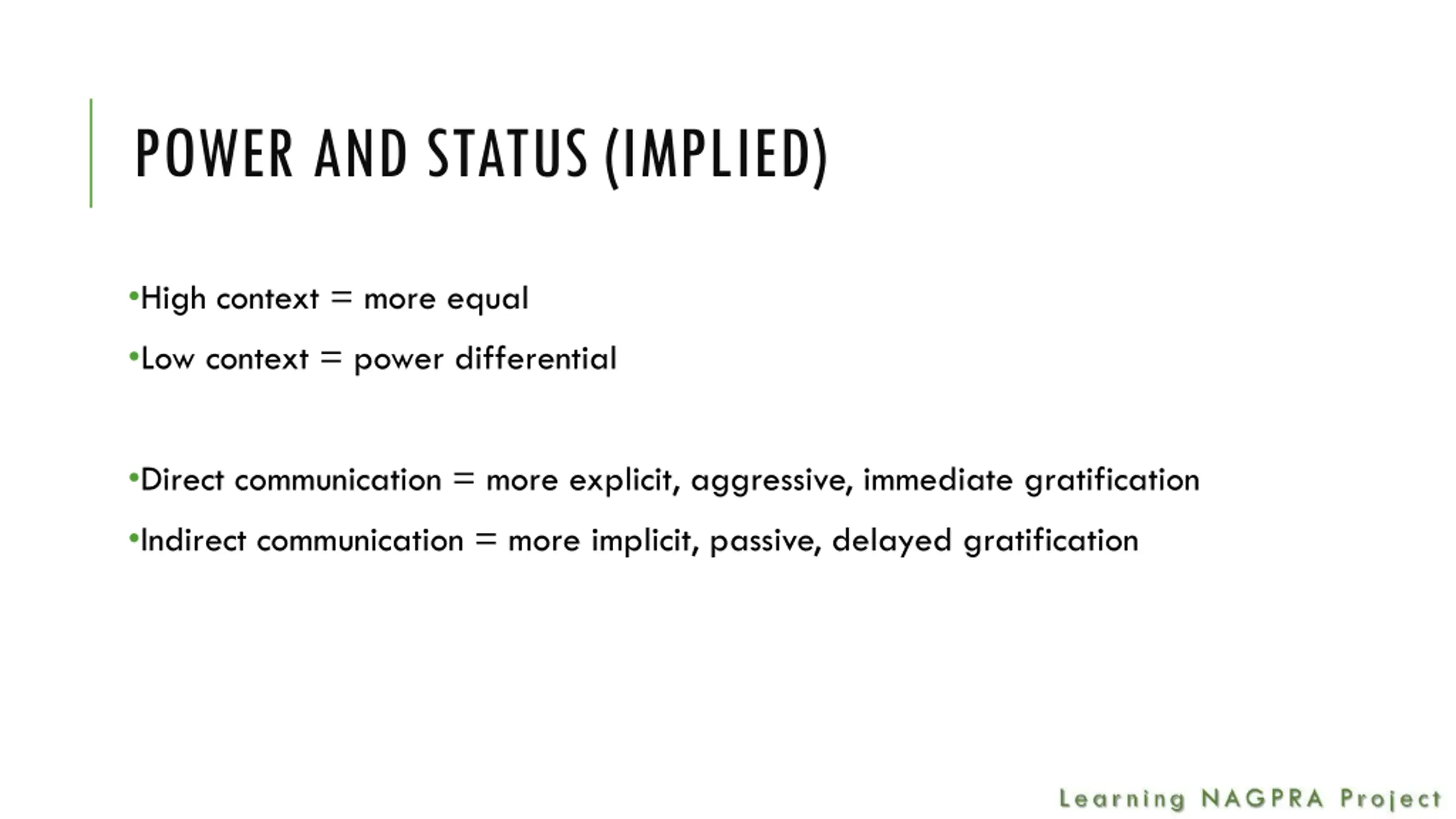 POWER AND STATUS (IMPLIED) High context = more equal Low context = power differential Direct communication = more explicit, aggressive, immediate gratification Indirect communication = more implicit, passive, delayed gratification