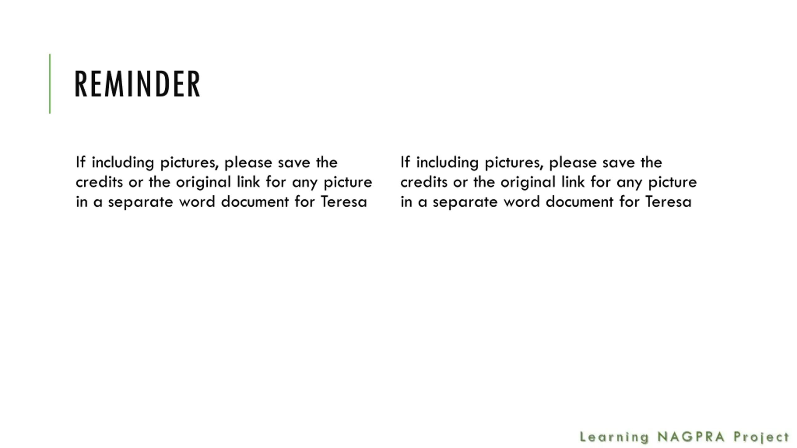 REMINDER If including pictures, please save the credits or the original link for any picture in a separate word document for Teresa If including pictures, please save the credits or the original link for any picture in a separate word document for Teresa