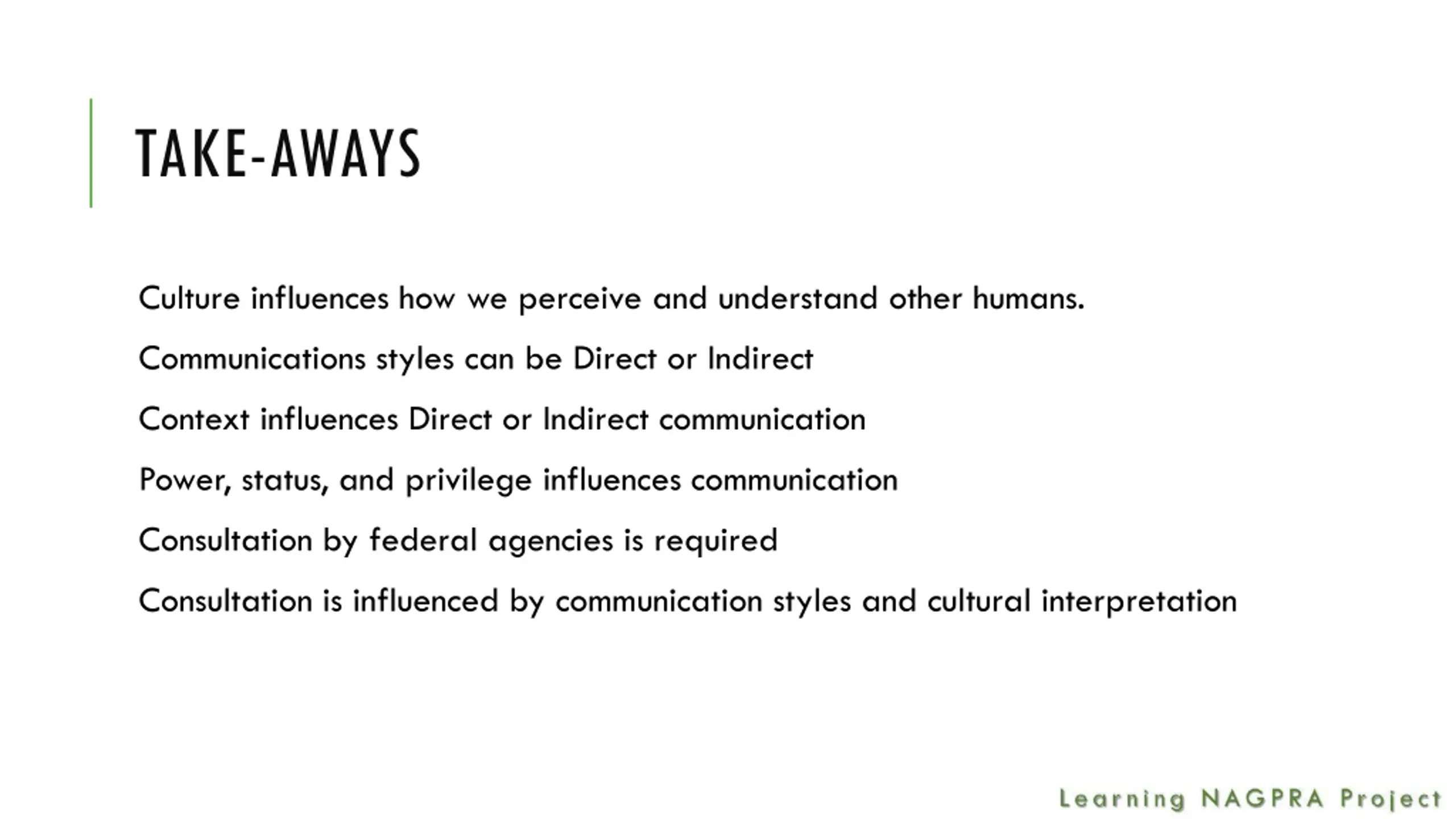 TAKE-AWAYS Culture influences how we perceive and understand other humans. Communications styles can be Direct or Indirect Context influences Direct or Indirect communication Power, status, and privilege influences communication Consultation by federal agencies is required Consultation is influenced by communication styles and cultural interpretation