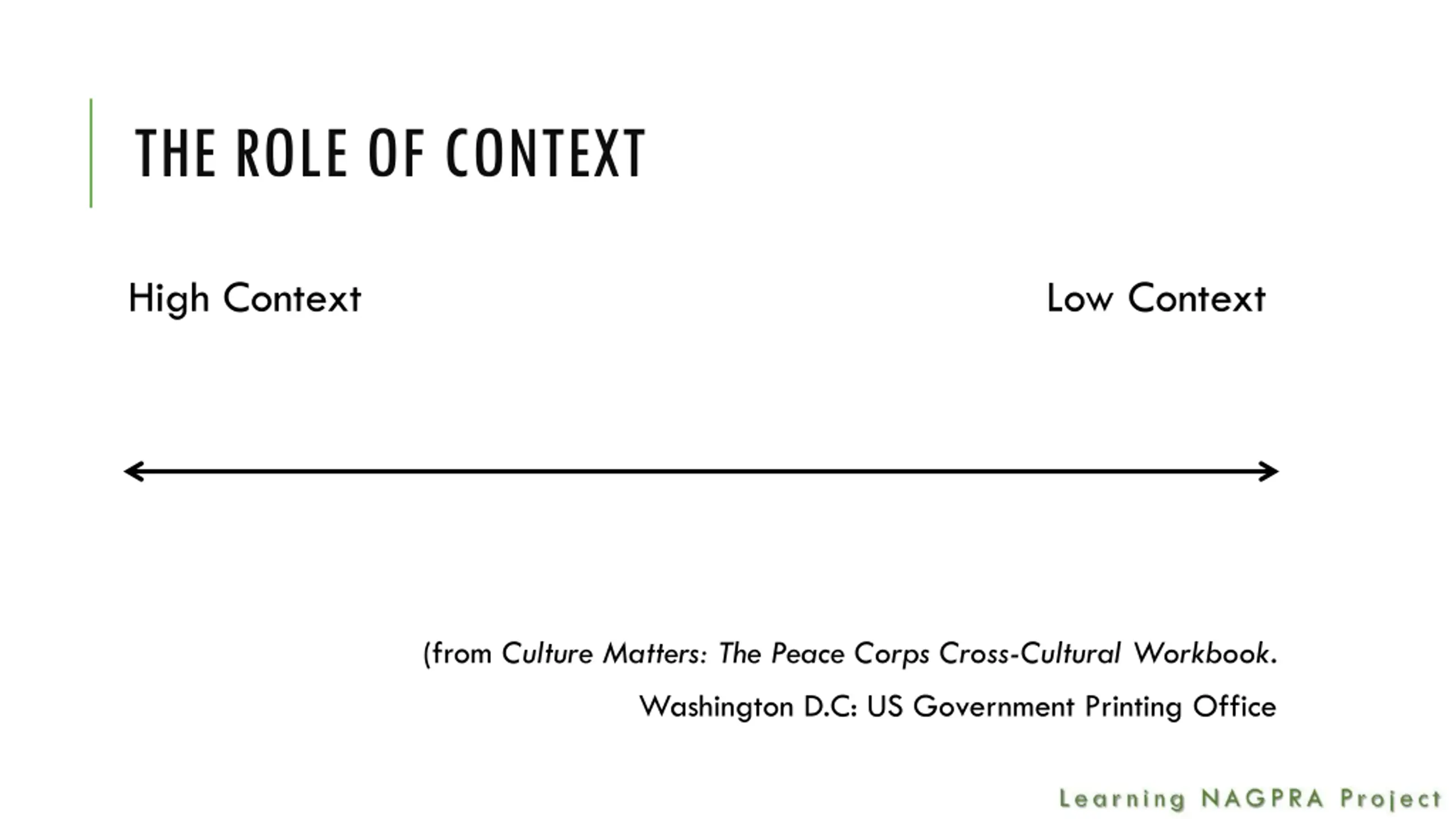 THE ROLE OF CONTEXT High Context Low Context (from Culture Matters: The Peace Corps Cross-Cultural Workbook. Washington D.C: US Government Printing Office