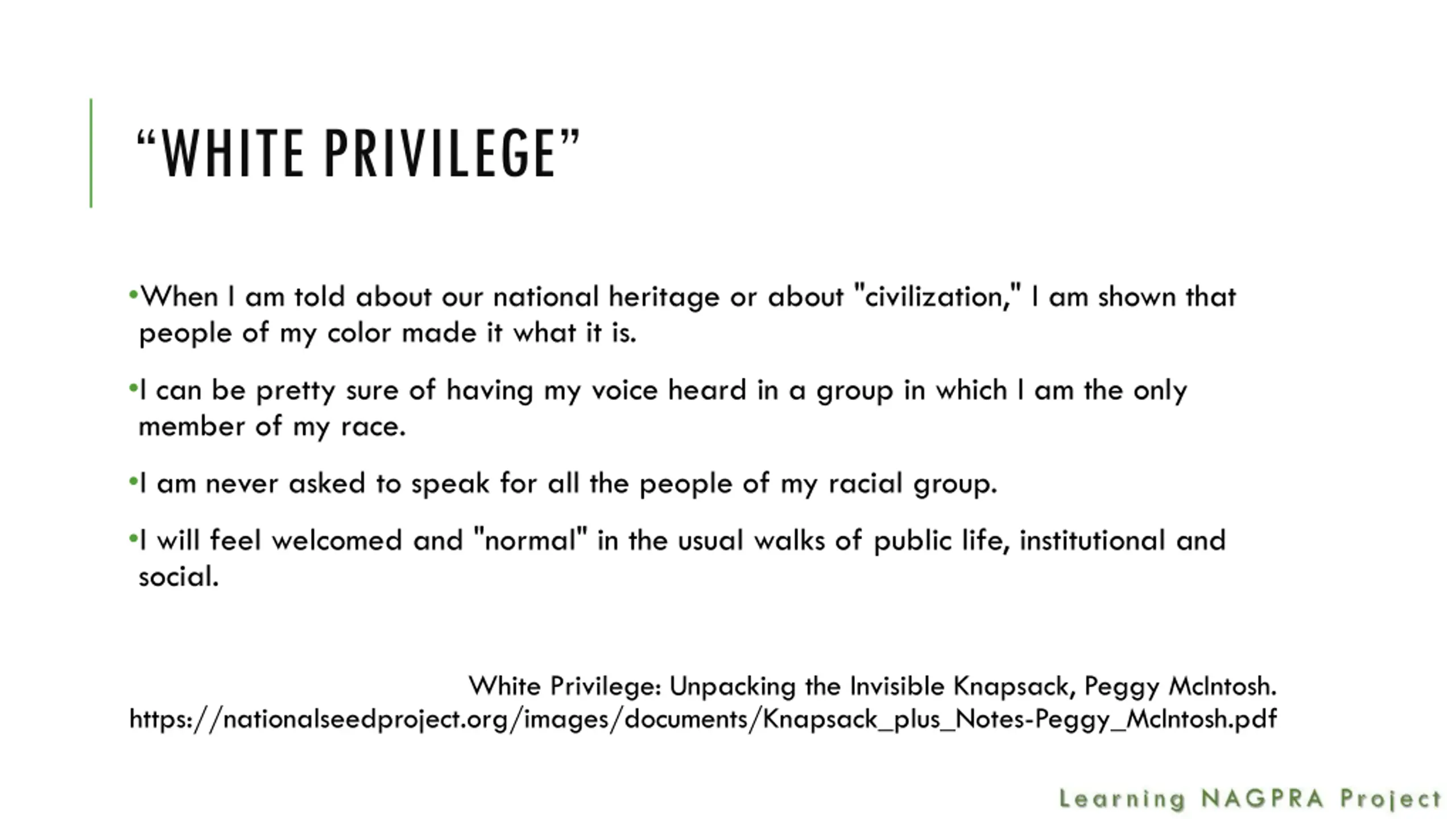 WHITE PRIVILEGE When I am told about our national heritage or about "civilization," I am shown that people of my color made it what it is. I can be pretty sure of having my voice heard in a group in which I am the only member of my race. I am never asked to speak for all the people of my racial group. I will feel welcomed and "normal" in the usual walks of public life, institutional and social. White Privilege: Unpacking the Invisible Knapsack, Peggy McIntosh. https://nationalseedproject.org/images/documents/Knapsack_plus_Notes-Peggy_McIntosh.pdf