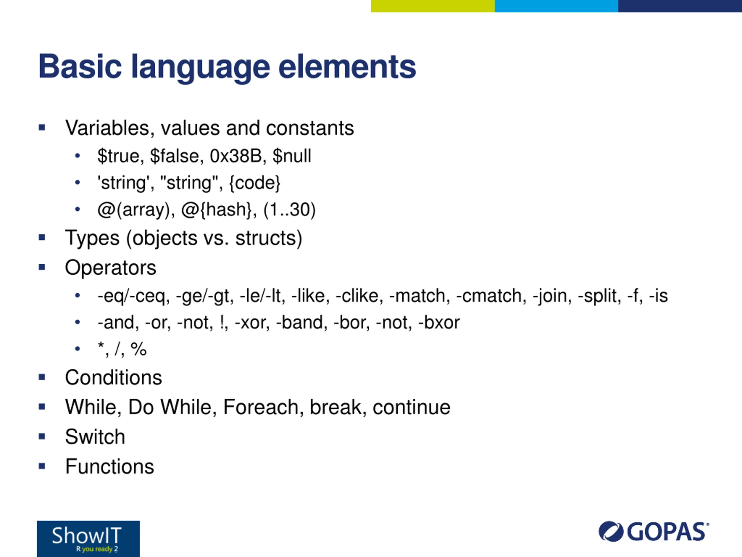 Basic language elements Variables, values and constants $true, $false, 0x38B, $null 'string', "string", {code} @(array), @{hash}, (1..30) Types (objects vs. structs) Operators -eq/-ceq, -ge/-gt, -le/-lt, -like, -clike, -match, -cmatch, -join, -split, -f, -is -and, -or, -not, !, -xor, -band, -bor, -not, -bxor *, /, % Conditions While, Do While, Foreach, break, continue Switch Functions