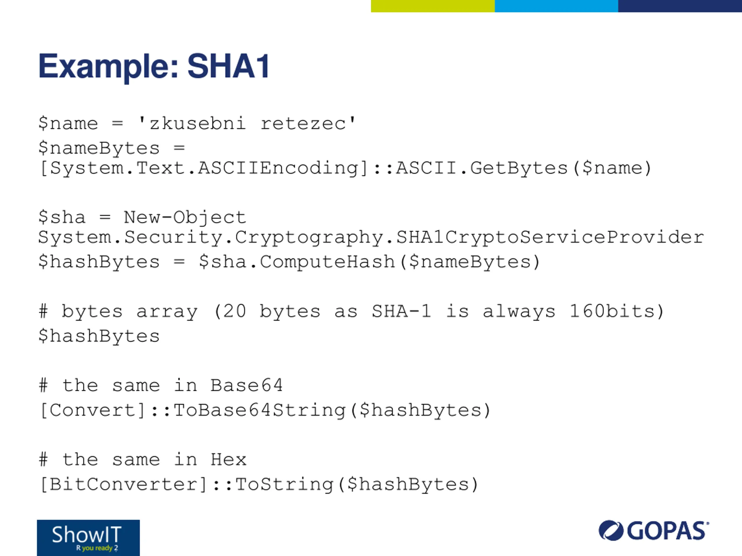 Example: SHA1 $name = 'zkusebni retezec' $nameBytes = [System.Text.ASCIIEncoding]::ASCII.GetBytes($name) $sha = New-Object System.Security.Cryptography.SHA1CryptoServiceProvider $hashBytes = $sha.ComputeHash($nameBytes) # bytes array (20 bytes as SHA-1 is always 160bits) $hashBytes # the same in Base64 [Convert]::ToBase64String($hashBytes) # the same in Hex [BitConverter]::ToString($hashBytes)