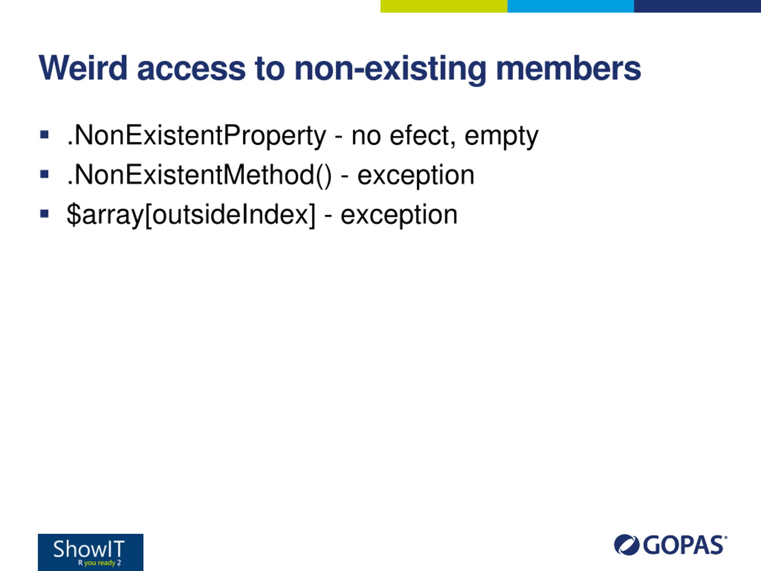 Weird access to non-existing members .NonExistentProperty - no efect, empty .NonExistentMethod() - exception $array[outsideIndex] - exception