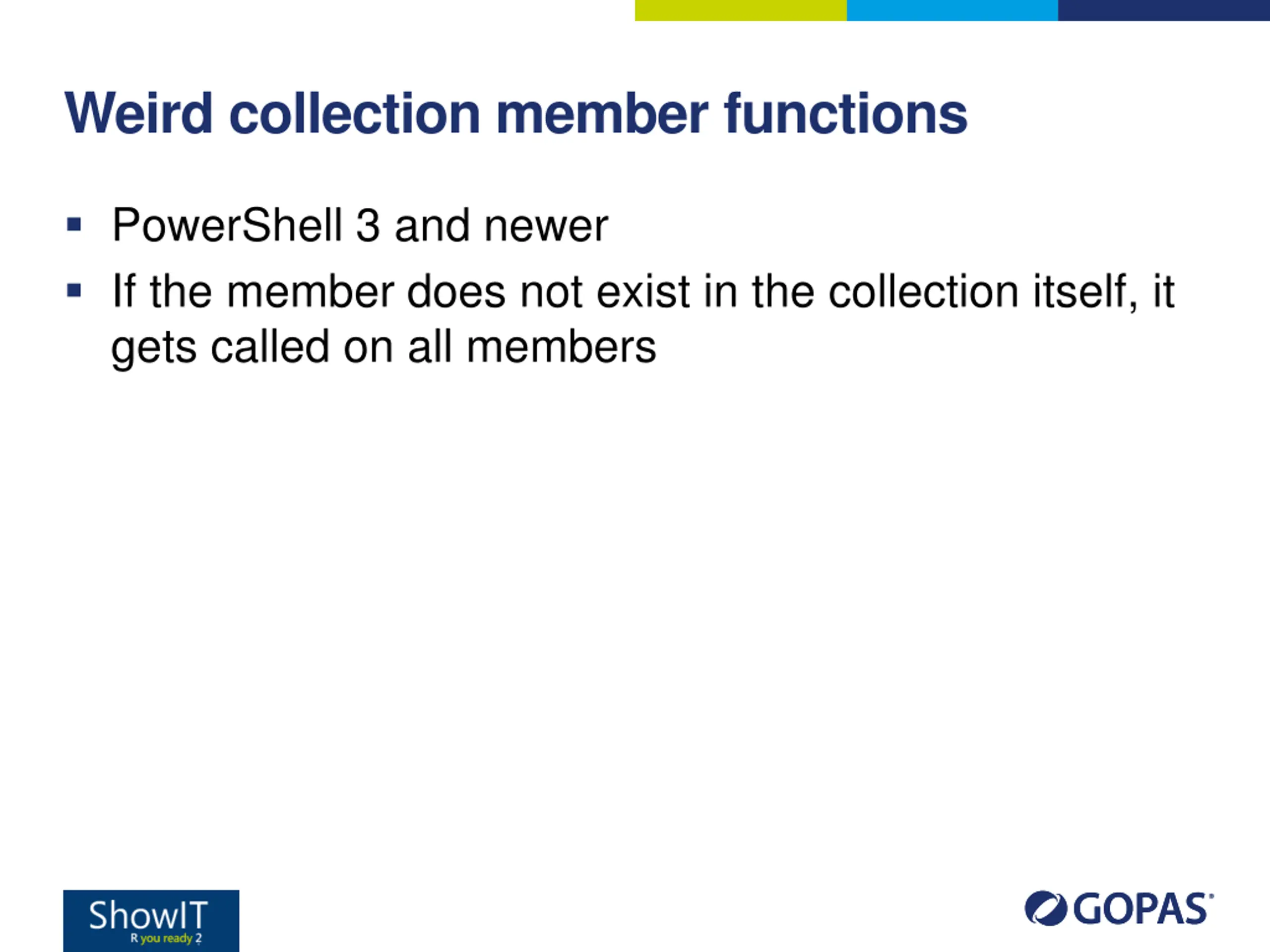 Weird collection member functions PowerShell 3 and newer If the member does not exist in the collection itself, it gets called on all members
