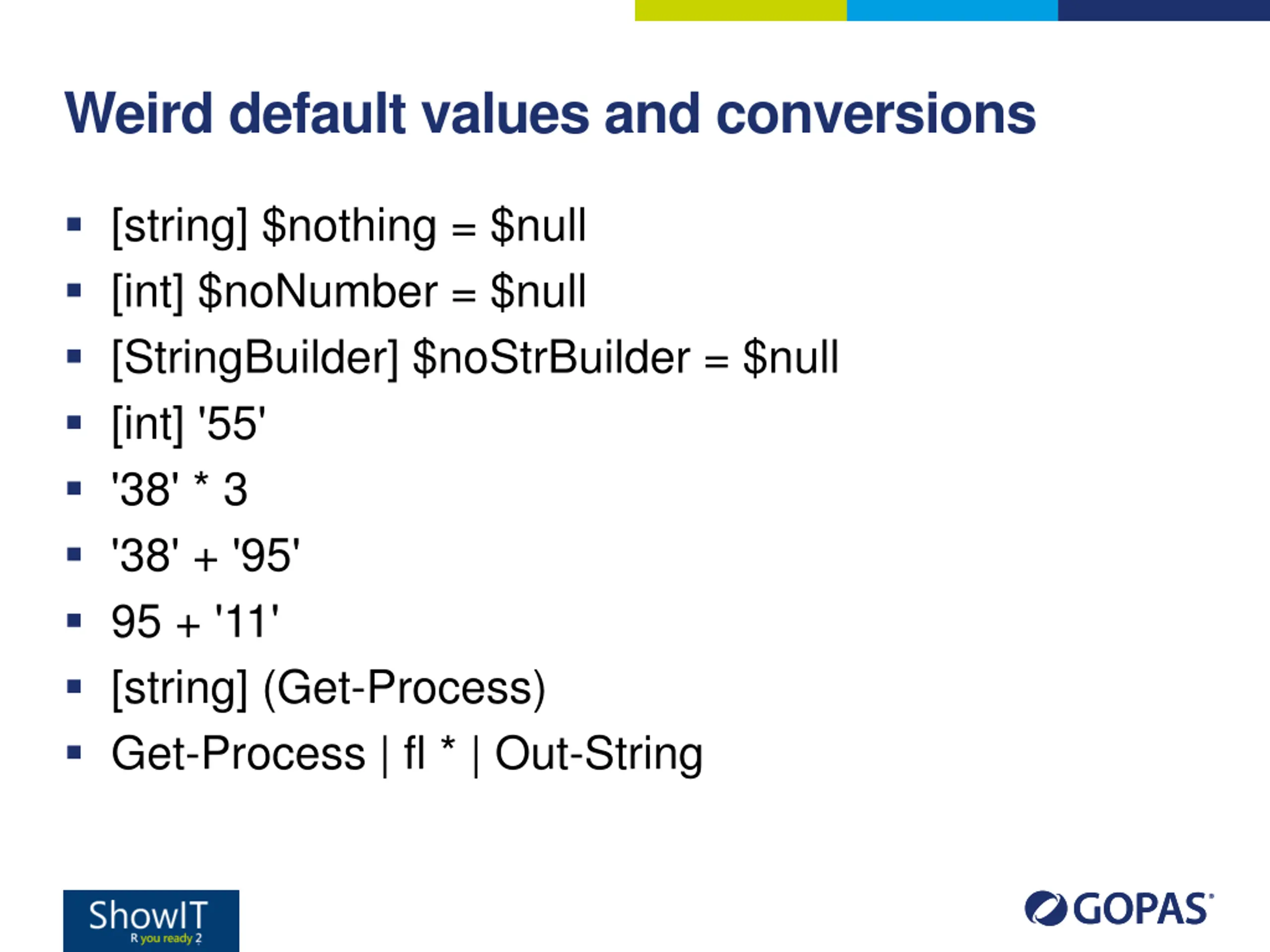 Weird default values and conversions [string] $nothing = $null [int] $noNumber = $null [StringBuilder] $noStrBuilder = $null [int] '55' '38' * 3 '38' + '95' 95 + '11' [string] (Get-Process) Get-Process | fl * | Out-String