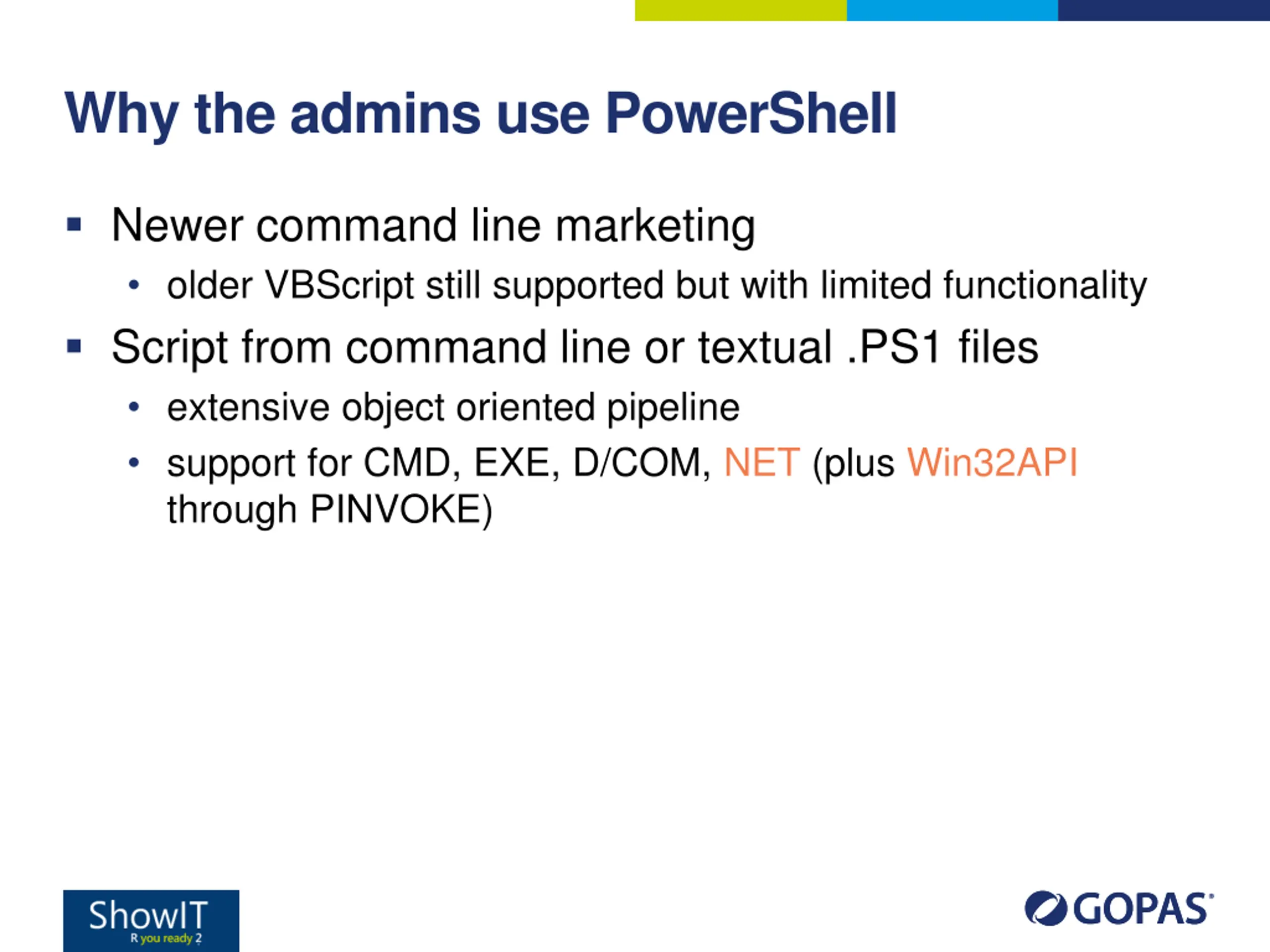 Why the admins use PowerShell Newer command line marketing older VBScript still supported but with limited functionality Script from command line or textual .PS1 files extensive object oriented pipeline support for CMD, EXE, D/COM, NET (plus Win32API through PINVOKE)