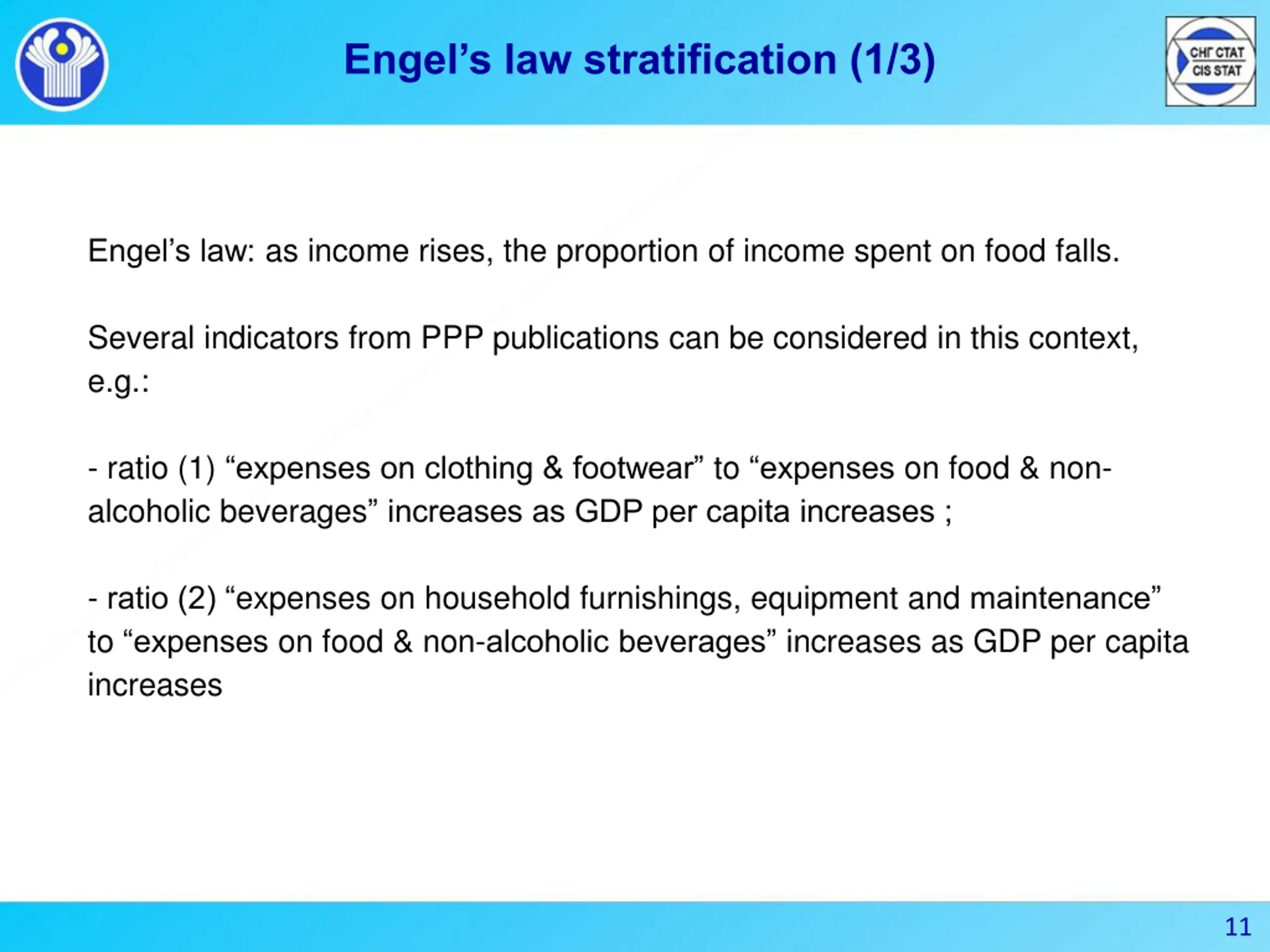 Engels law stratification (1/3) Engel s law: as income rises, the proportion of income spent on food falls. Several indicators from PPP publications can be considered in this context, e.g.: - ratio (1) expenses on clothing & footwear to expenses on food & non- alcoholic beverages increases as GDP per capita increases ; - ratio (2) expenses on household furnishings, equipment and maintenance to expenses on food & non-alcoholic beverages increases as GDP per capita increases 11