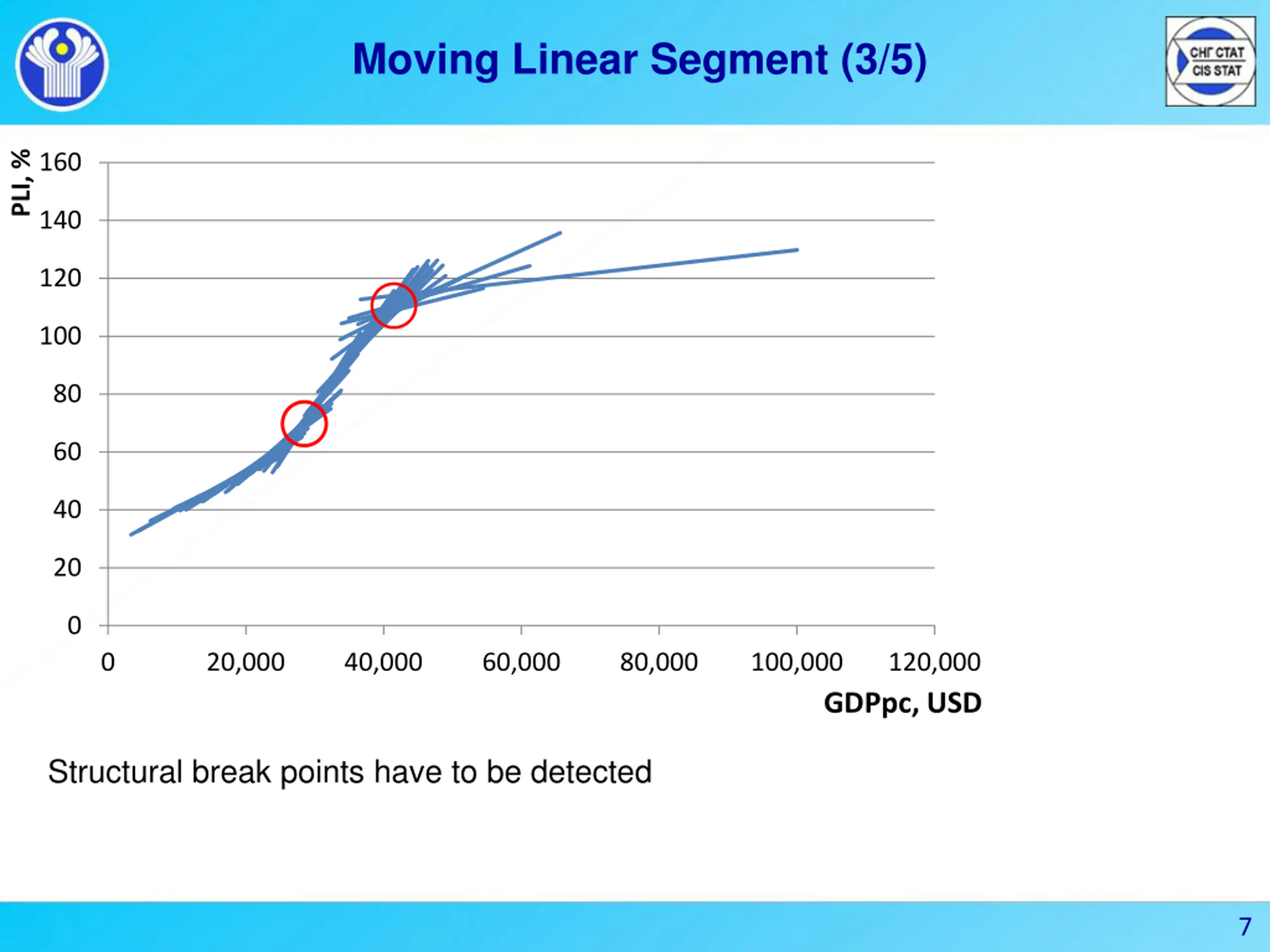 Moving Linear Segment (3/5) PLI, % 160 140 120 100 80 60 40 20 0 0 20,000 40,000 60,000 80,000 100,000 120,000 GDPpc, USD Structural break points have to be detected 7