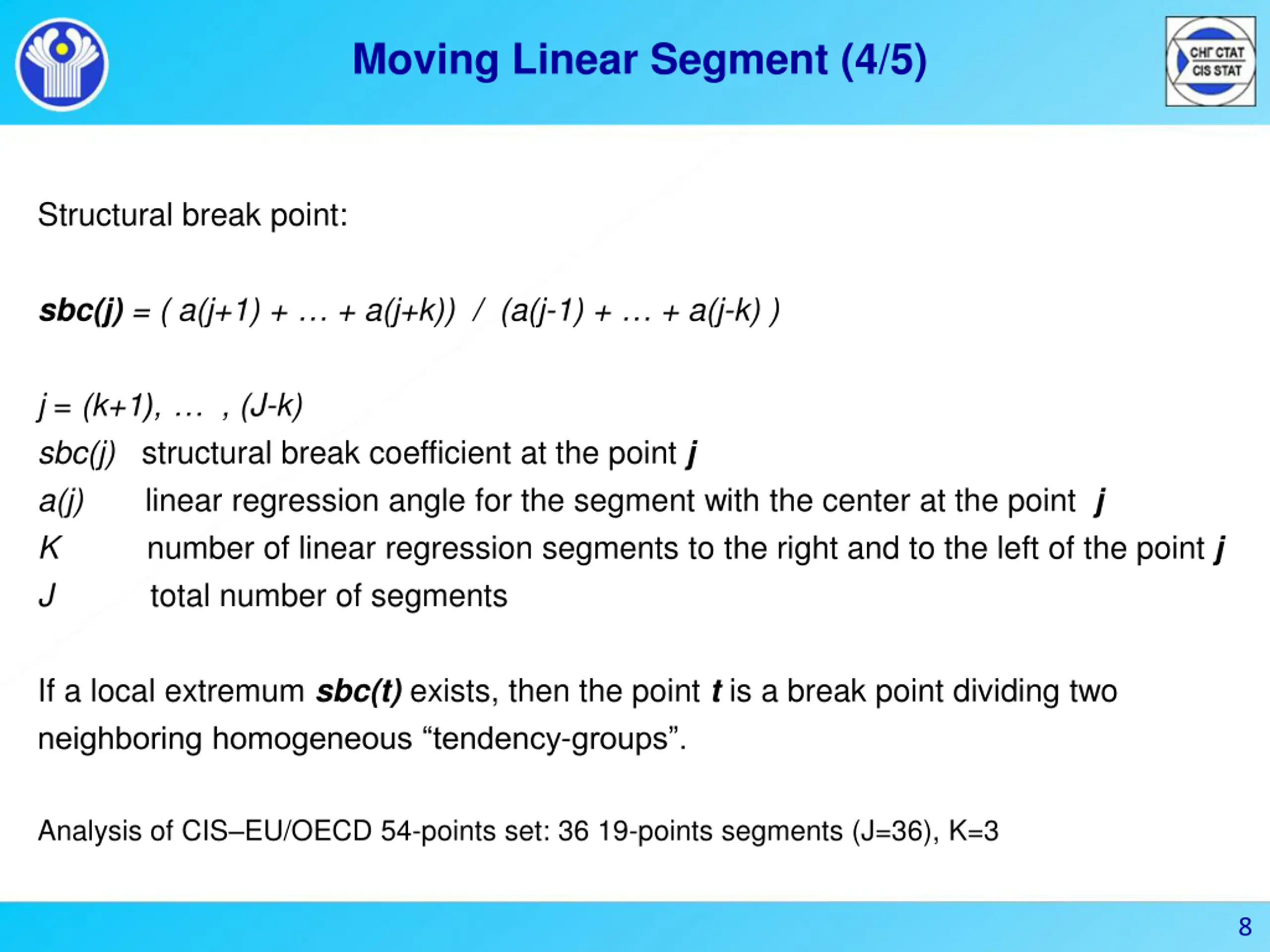 Moving Linear Segment (4/5) Structural break point: sbc(j) = ( a(j+1) + + a(j+k)) / (a(j-1) + + a(j-k) ) j = (k+1), , (J-k) sbc(j) structural break coefficient at the point j a(j) linear regression angle for the segment with the center at the point j K number of linear regression segments to the right and to the left of the point j J total number of segments If a local extremum sbc(t) exists, then the point t is a break point dividing two neighboring homogeneous tendency-groups . Analysis of CIS EU/OECD 54-points set: 36 19-points segments (J=36), K=3 8